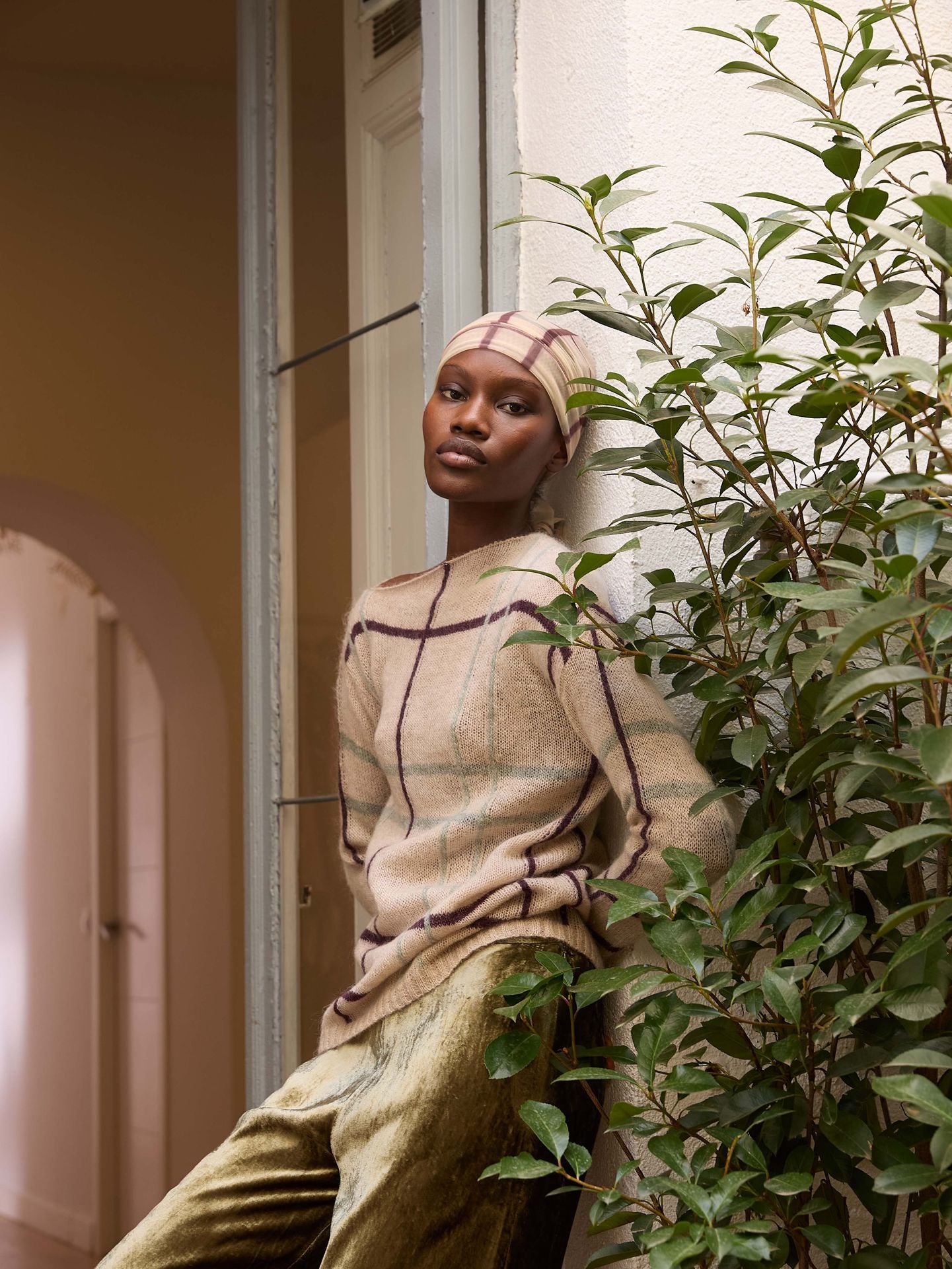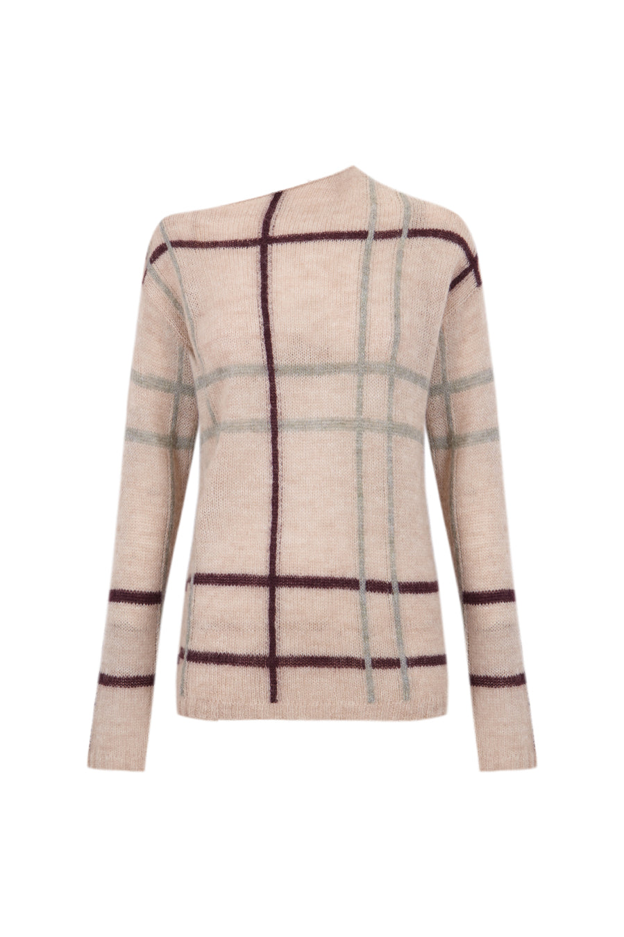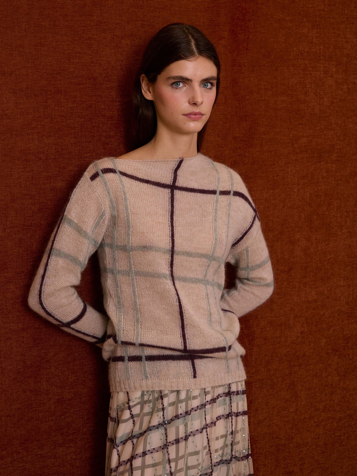 Jersey de manga larga color crudo con estampado de rayas que se cruzan formando cuadros en tonos verdes y morados. La calidad mezcla mohair y alpaca