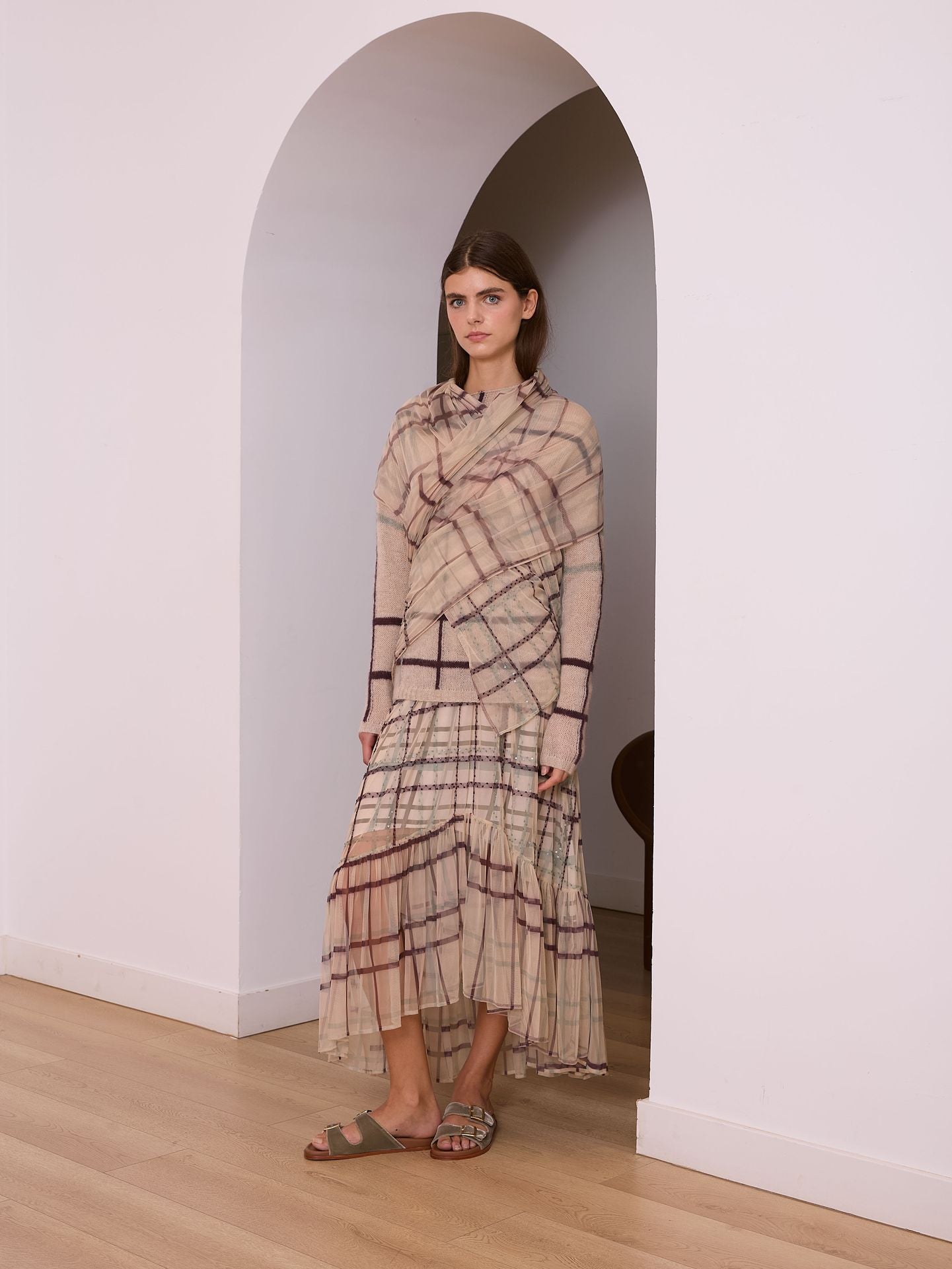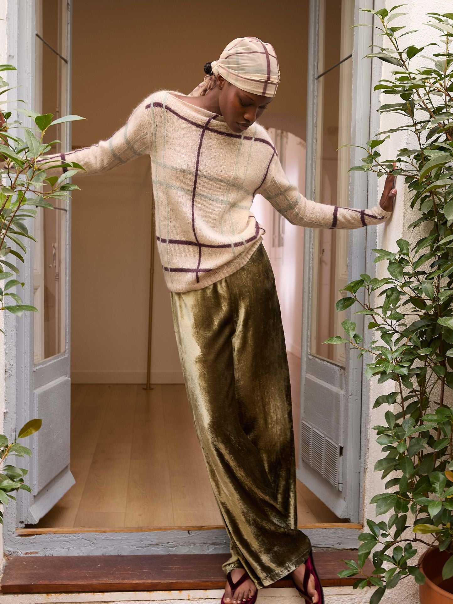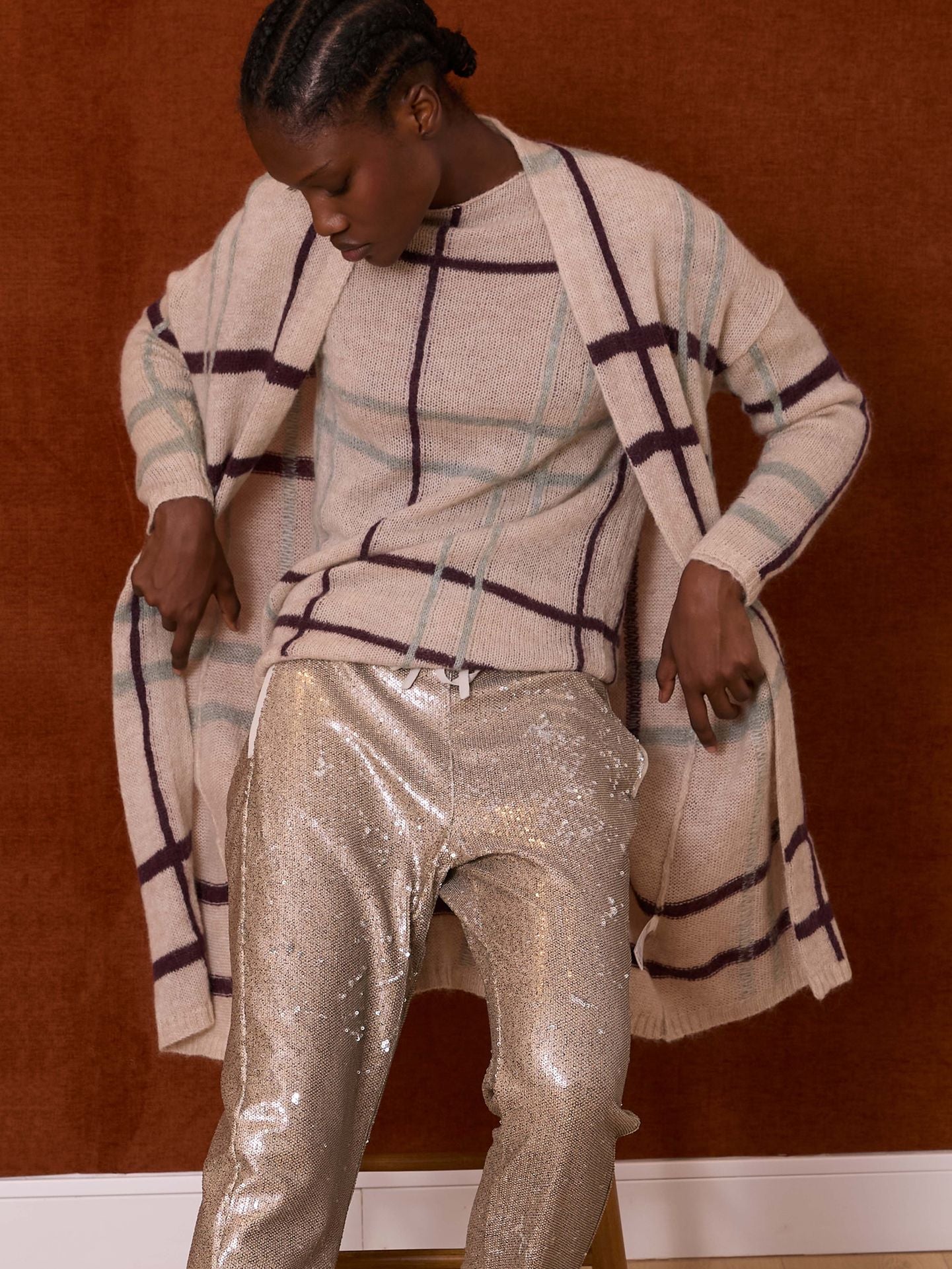 Jersey de manga larga color crudo con estampado de rayas que se cruzan formando cuadros en tonos verdes y morados. La calidad mezcla mohair y alpaca