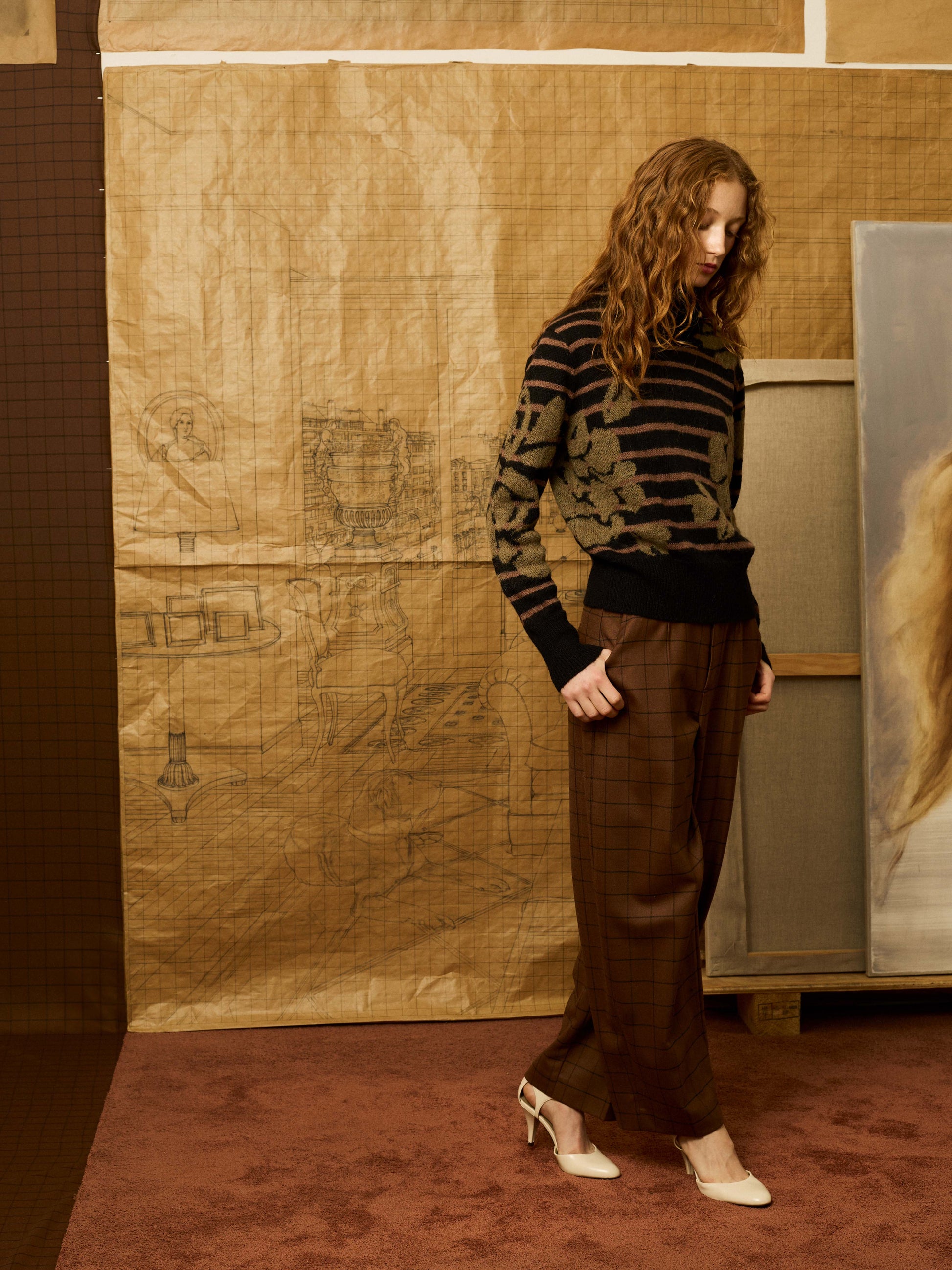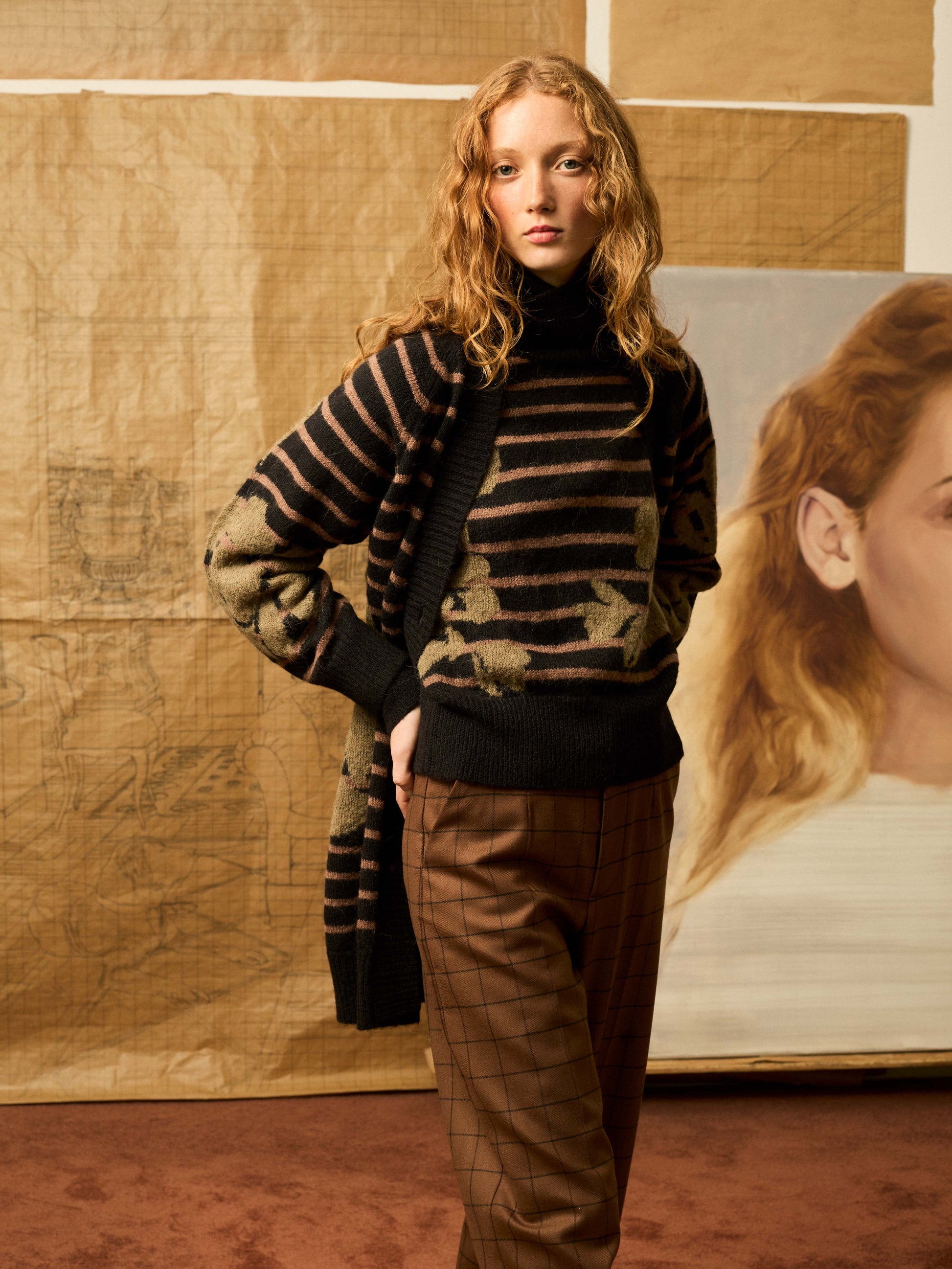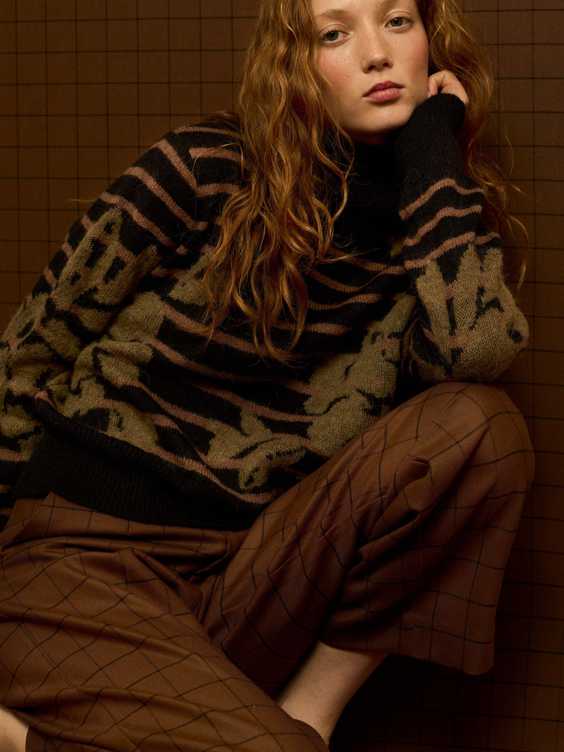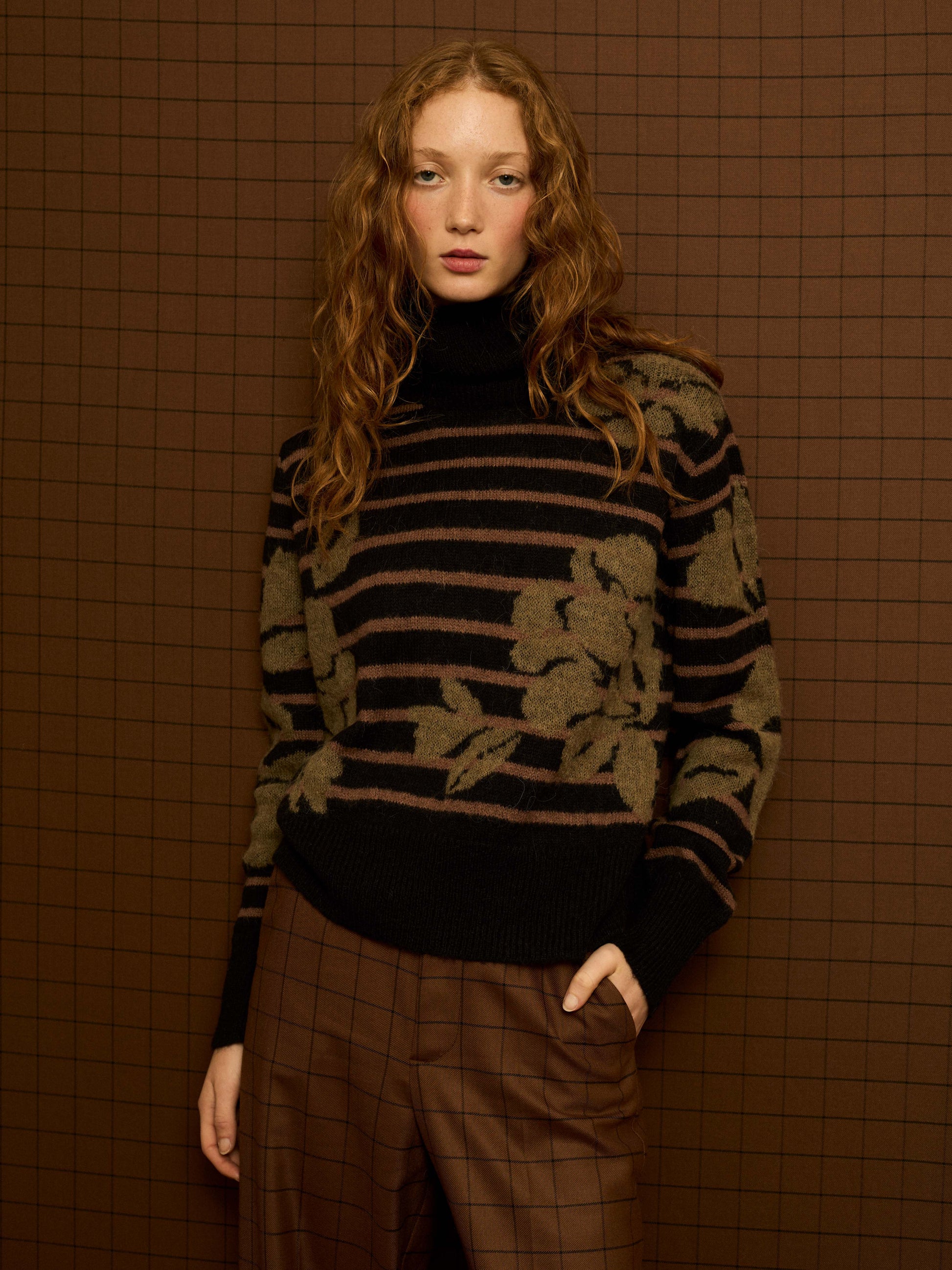 Jersey de cuello alto negro con rayas marrones y flores color kaki