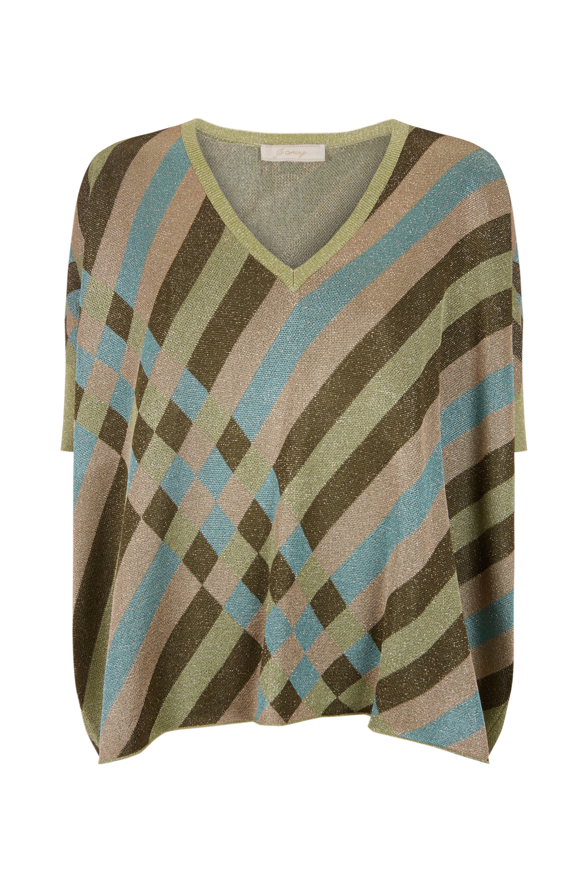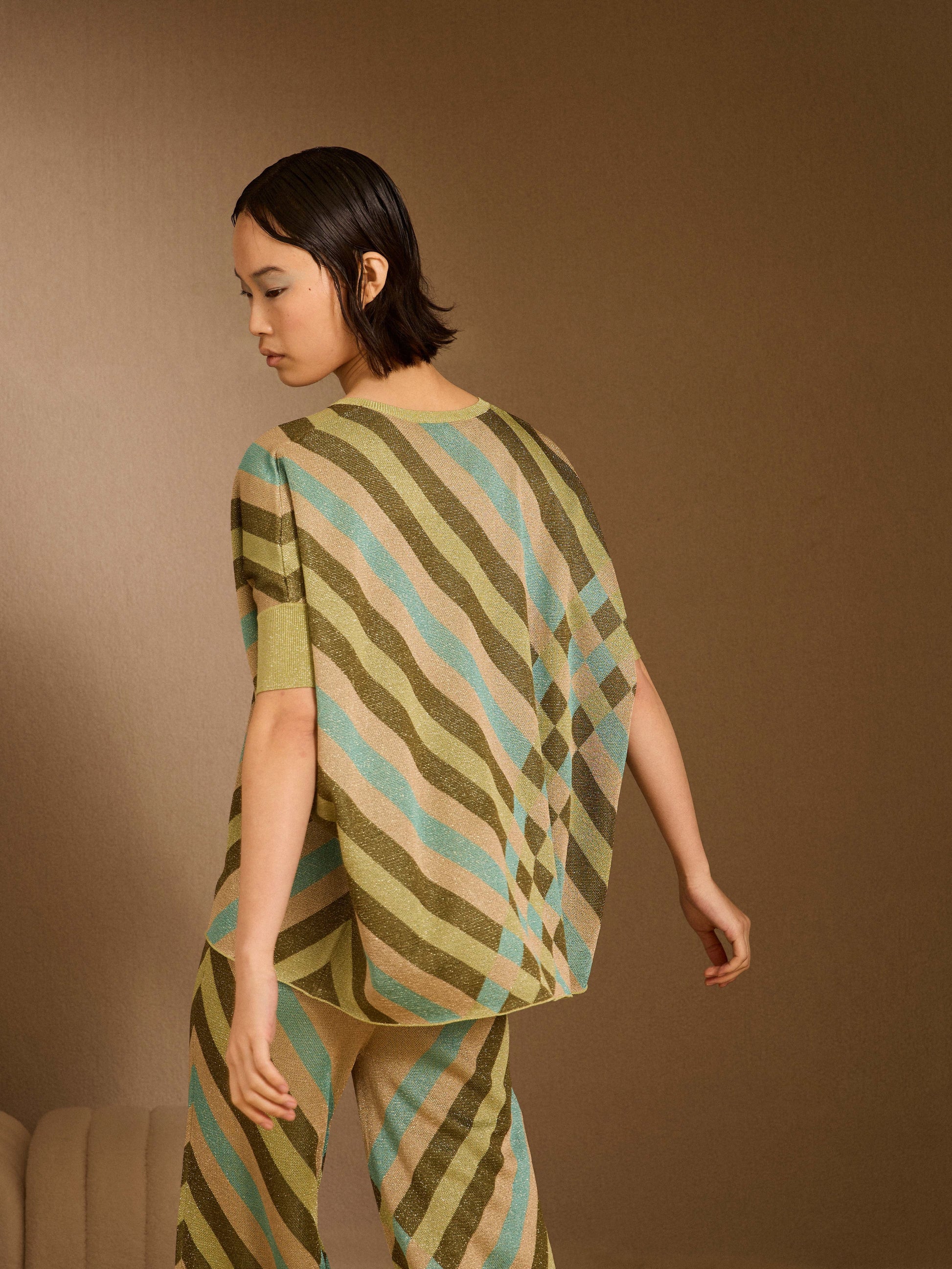 Jersey de lurex amplio recto con manga ajustada hasta el codo con estampado geométrico que combina diferentes verdes con tonos dorados y azul clarito