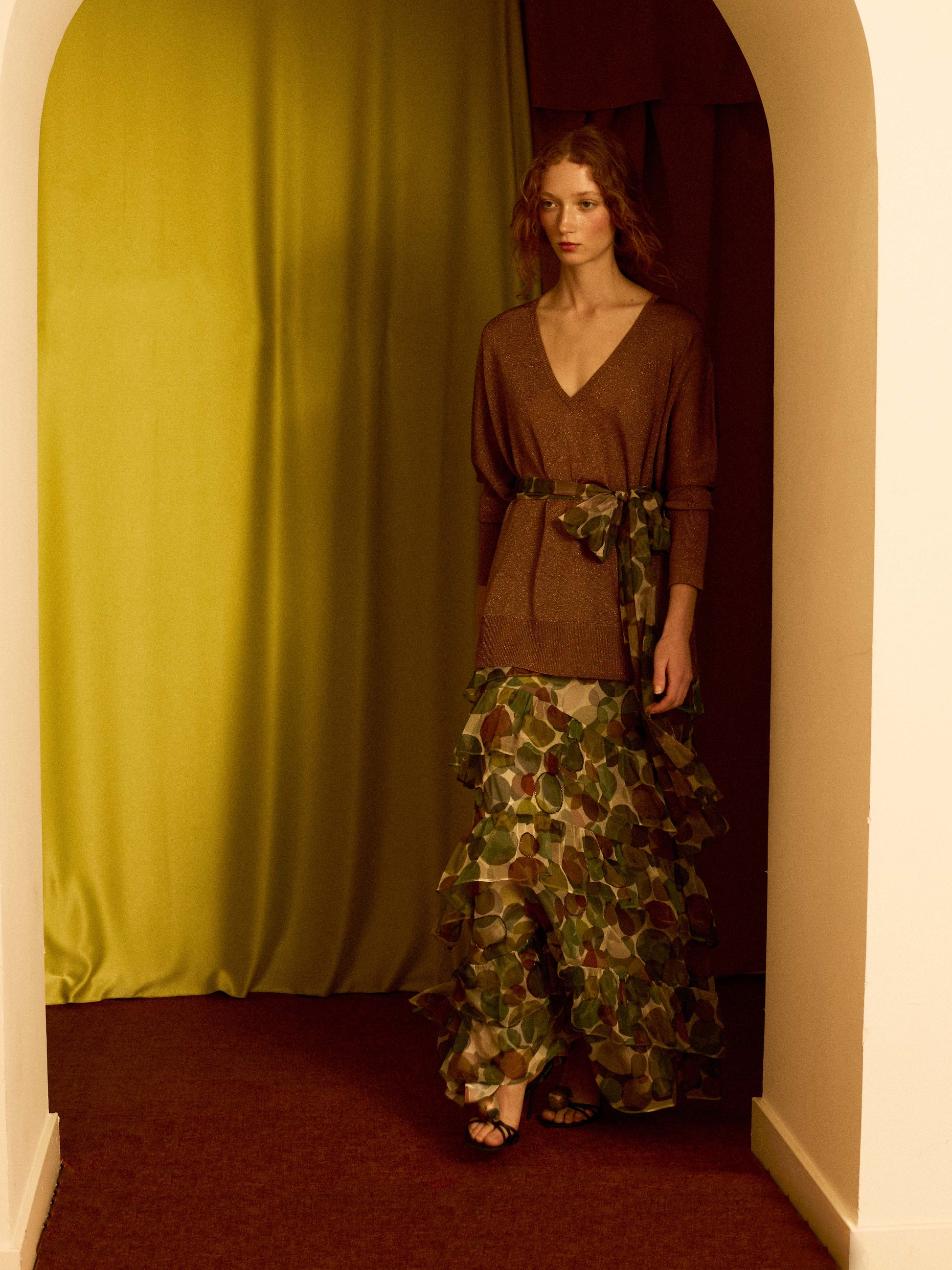 Jersey de cuello pico y manga larga en punto de lurex liso de color cobre