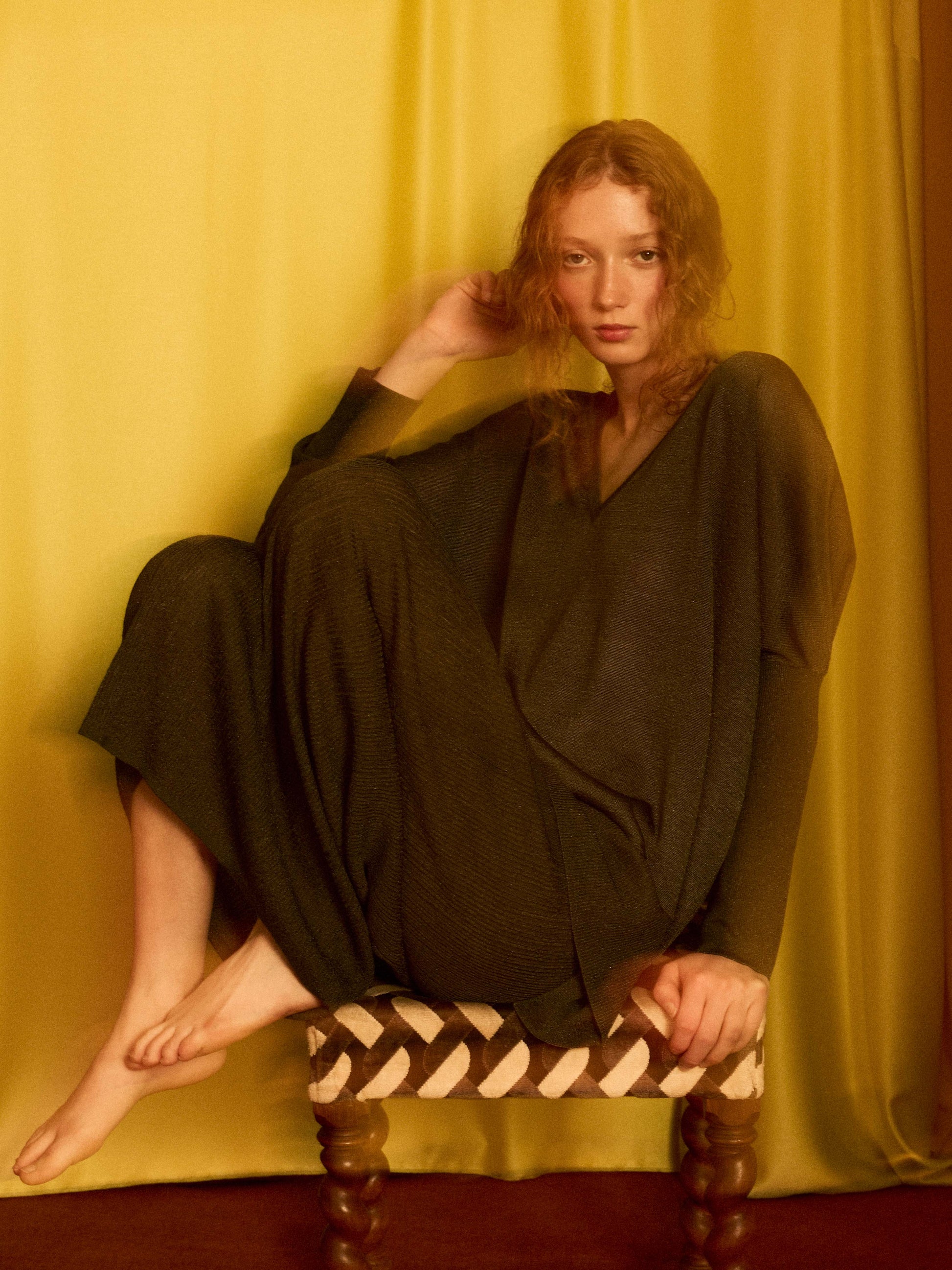 Jersey de cuello pico y manga larga en punto de lurex liso de color plomo