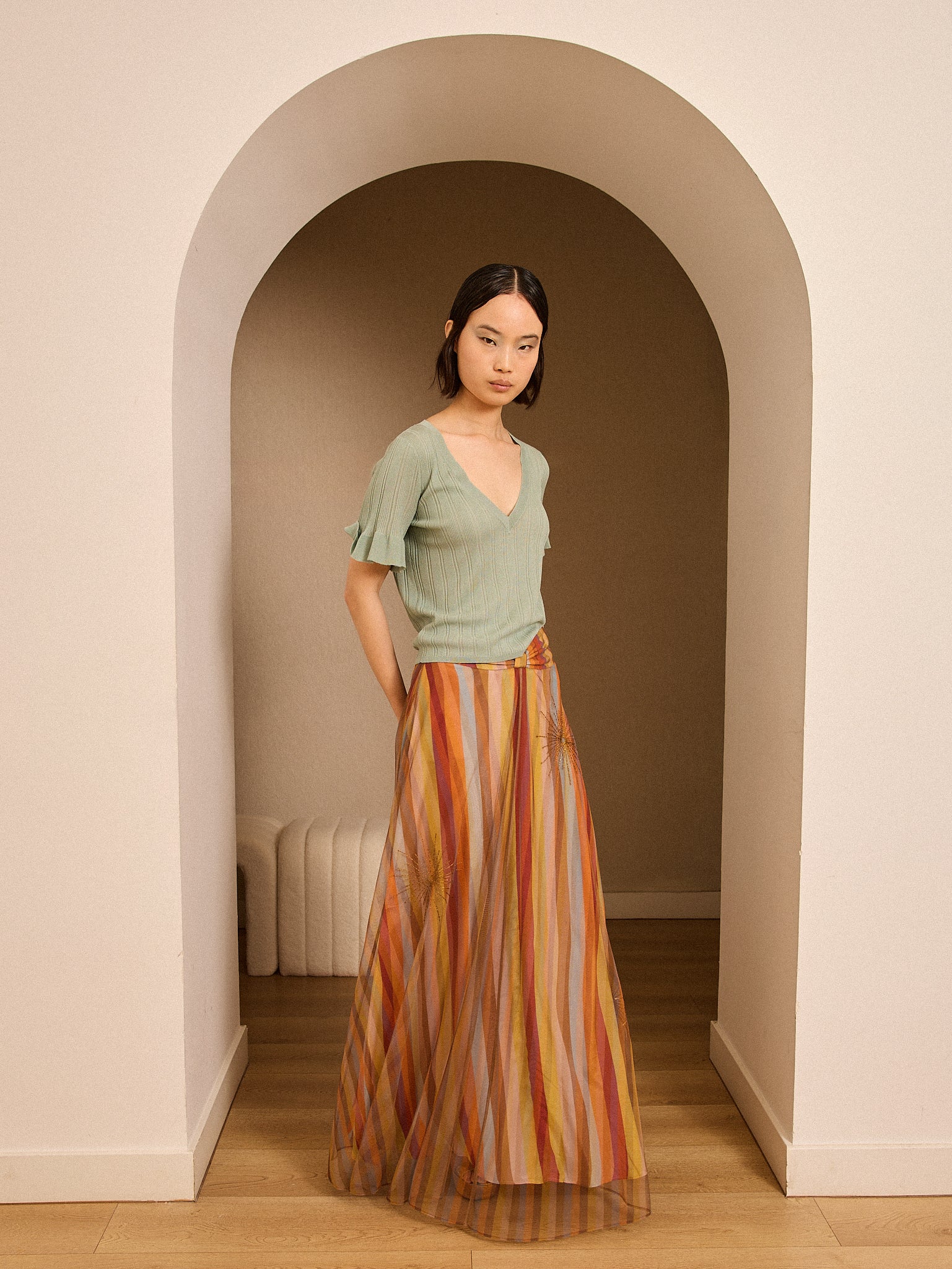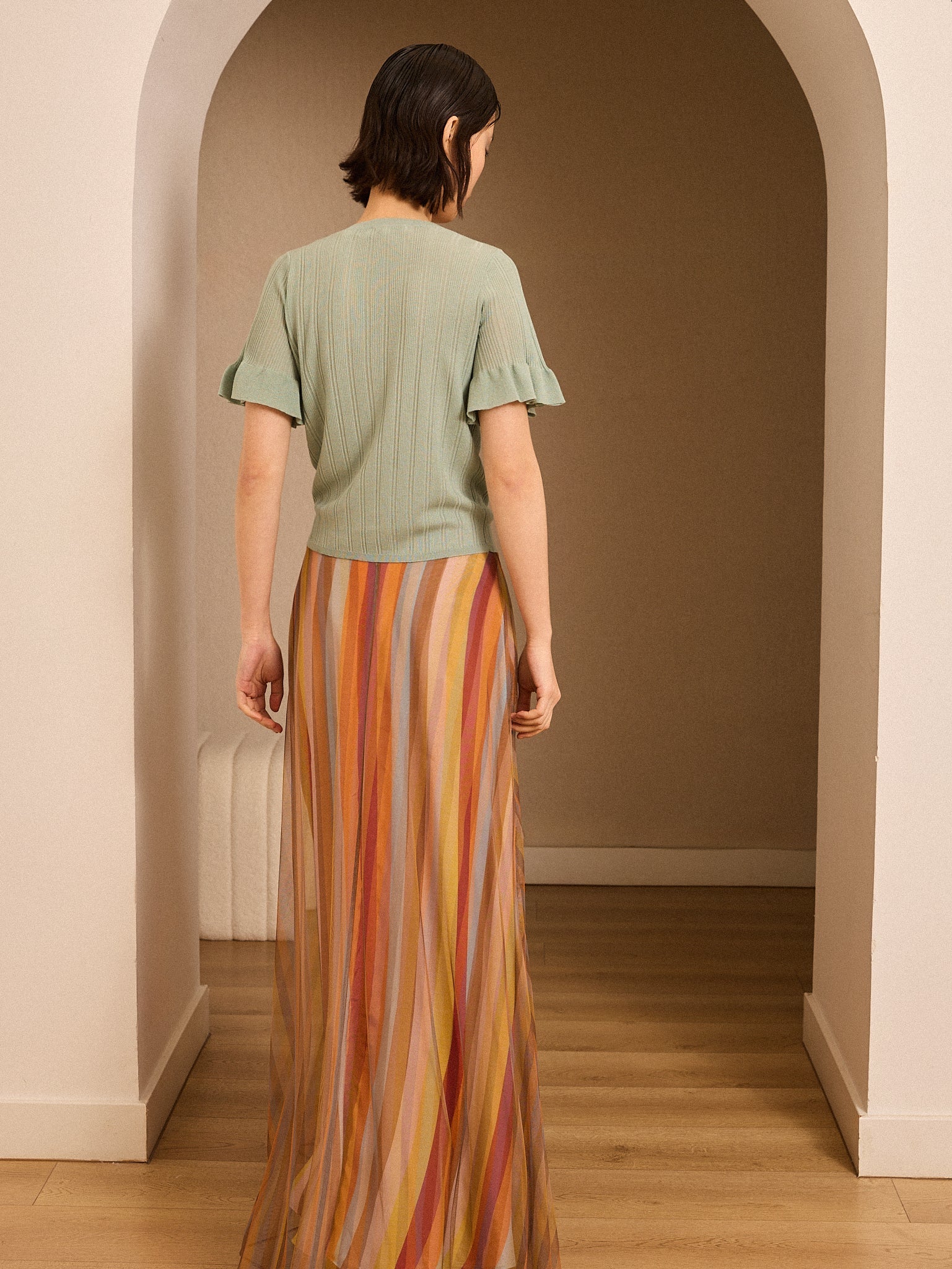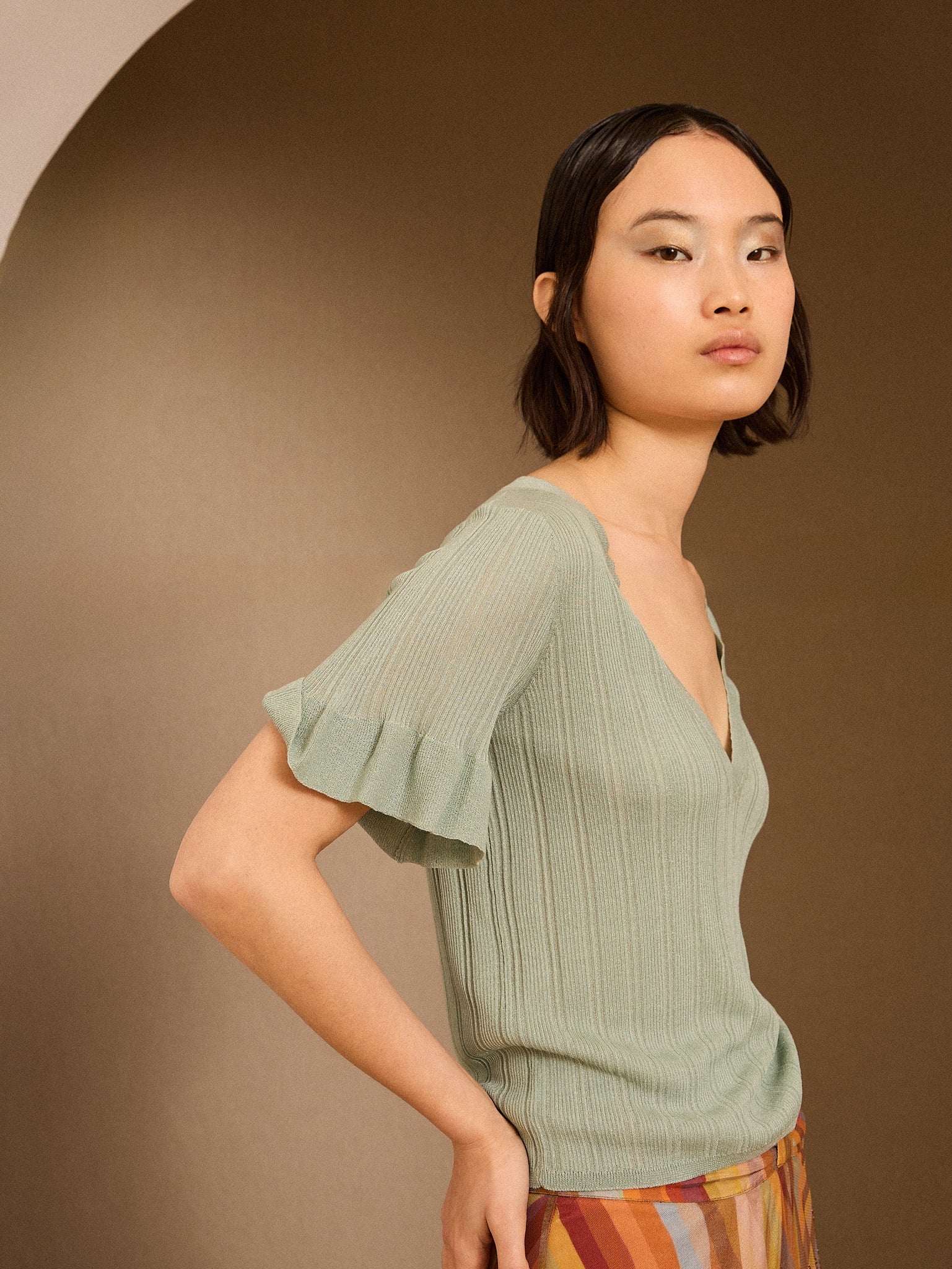 Jersey punto viscosa de color verde agua con detalle metalizado en el canalé. Con manga corta hasta el codo con detalle acabado en volante