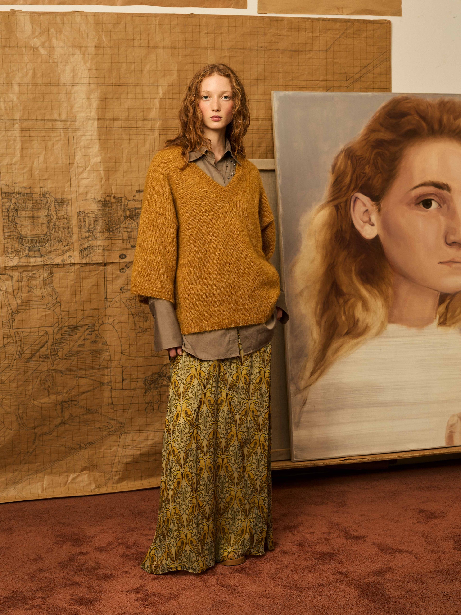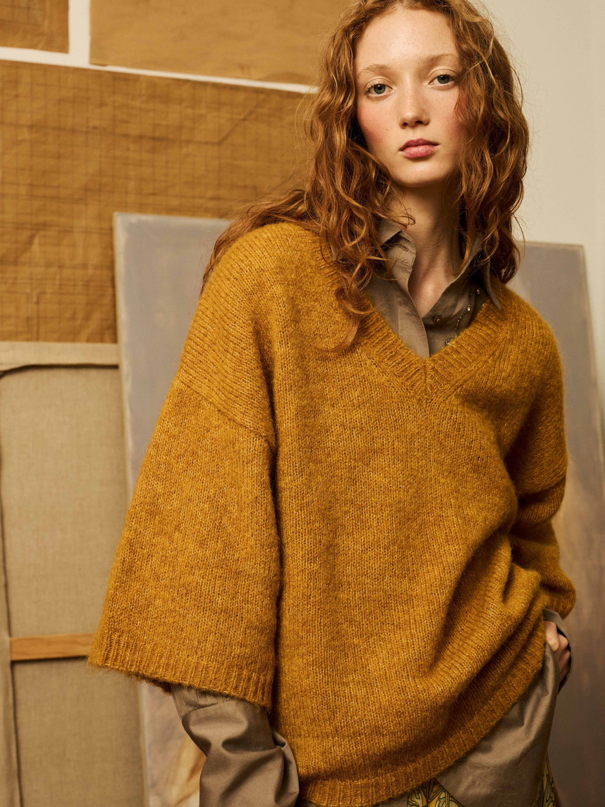 Jersey de pico en color amarillo, manga tres cuartos y corte amplio
