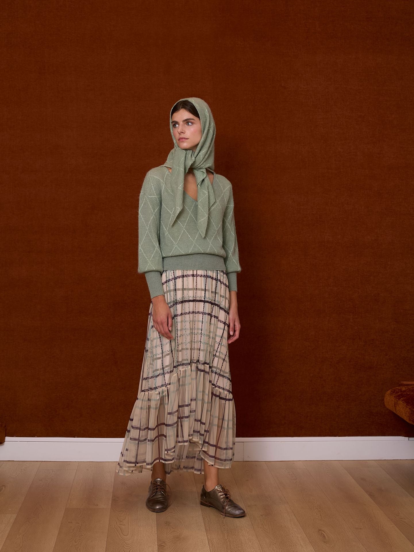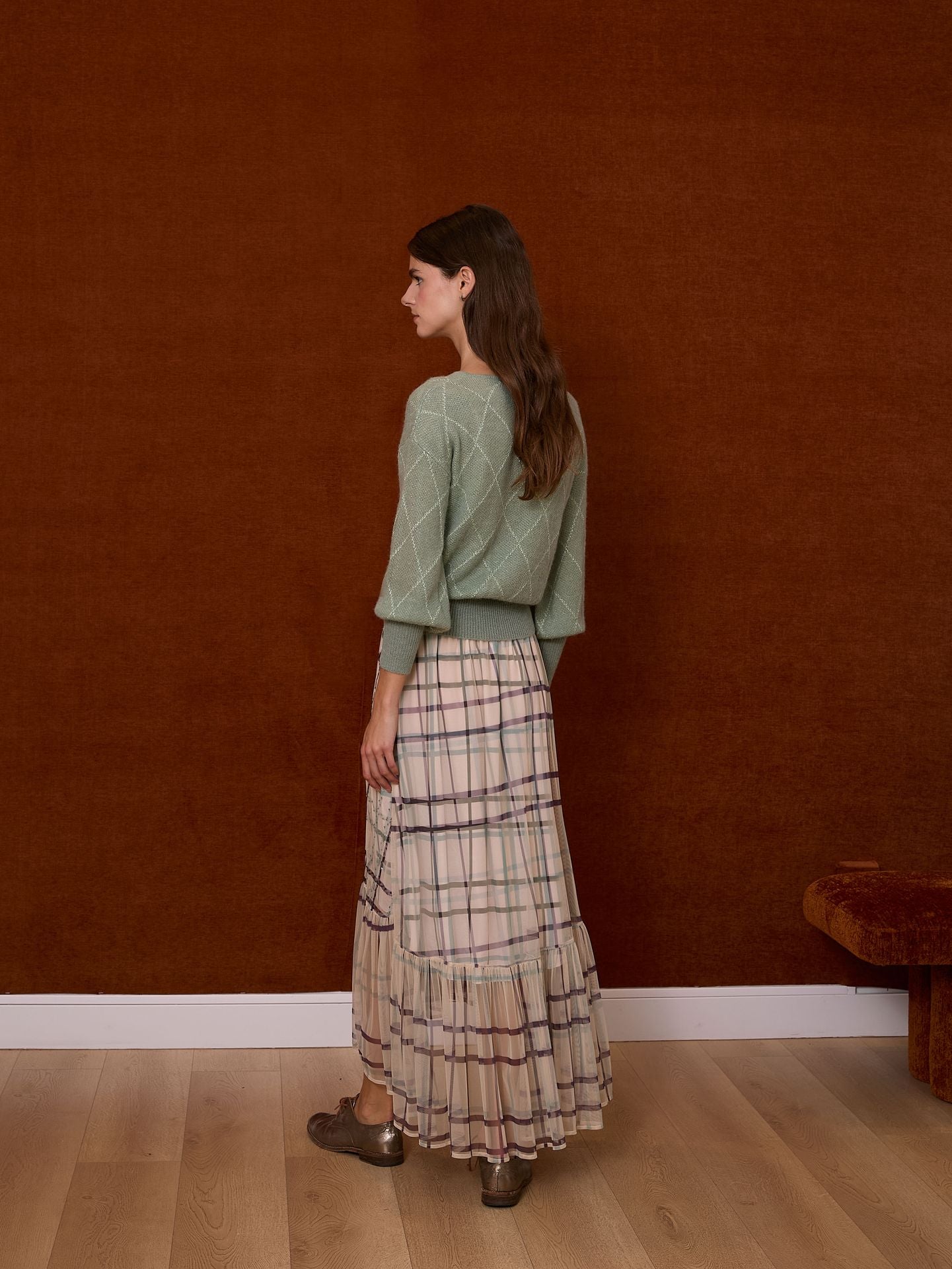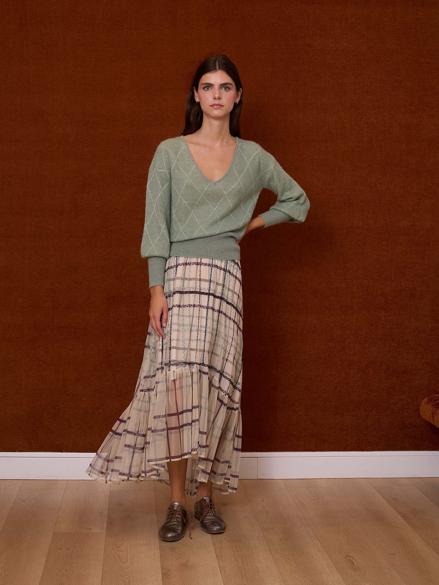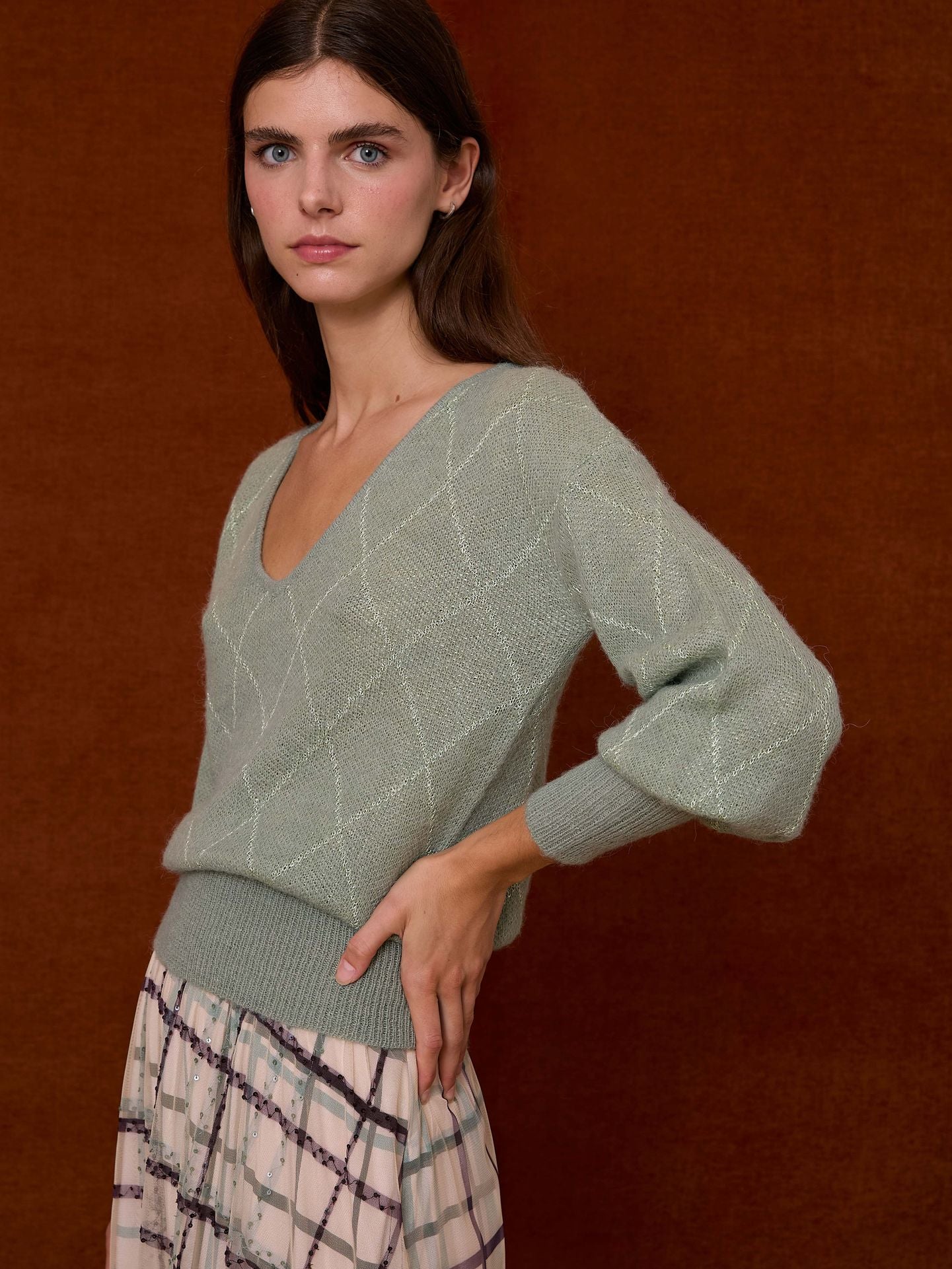Jersey de cuello pico con mangas abullonadas, ligeramente ablusonado. Detalle de rombos en hilatura metalizada al tono