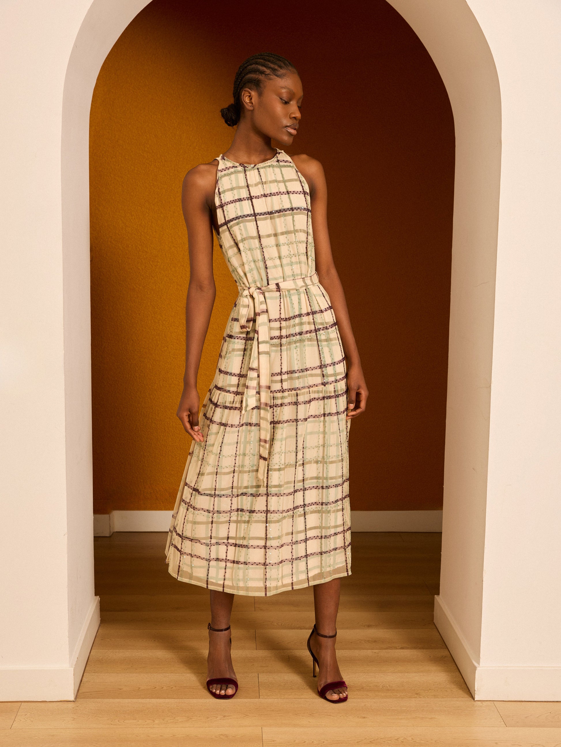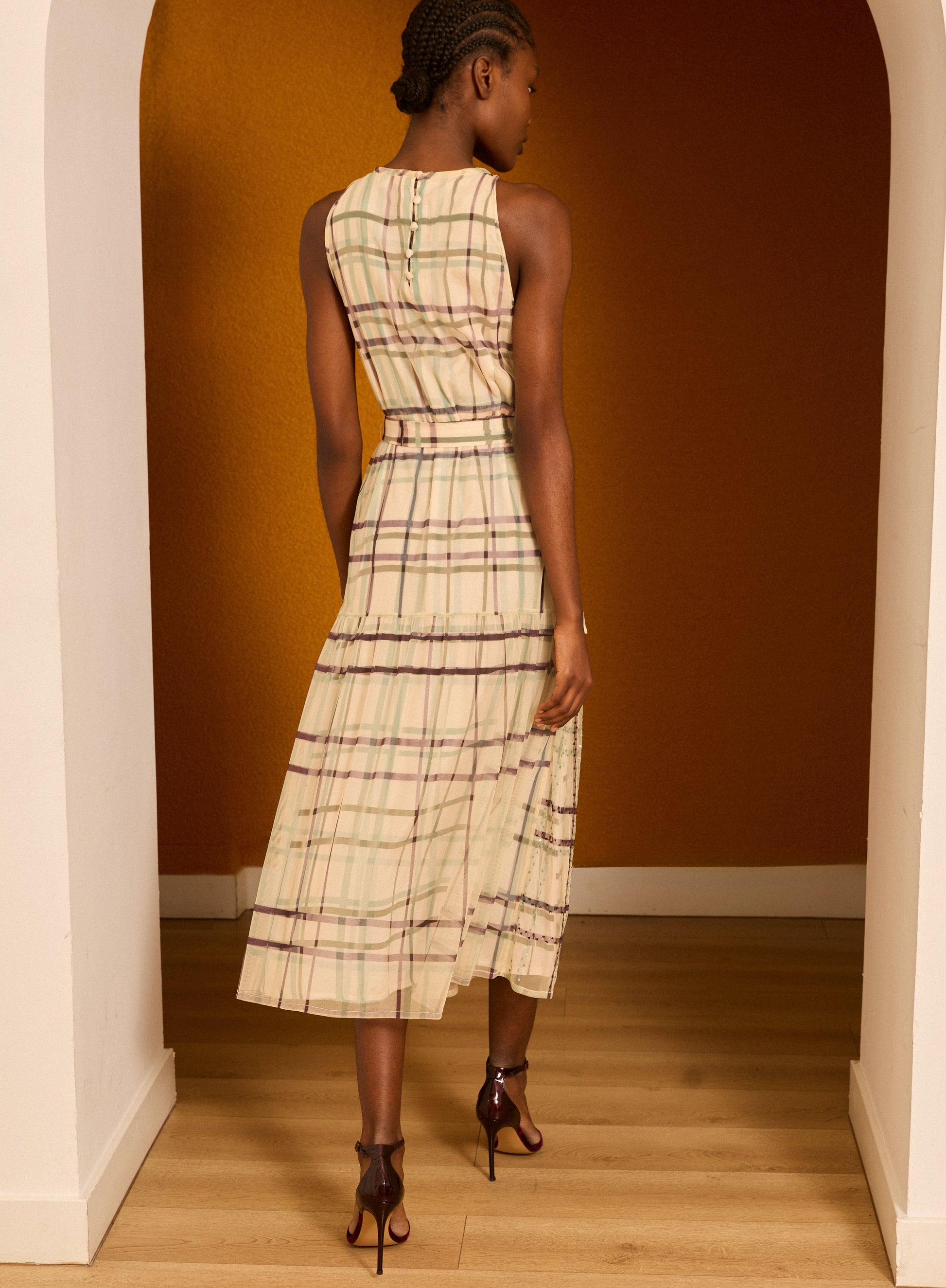 Vestido de tul de cuadros verdes sobre forro con el mismo estampado. Detalle de lentejuelas bordadas en el tul. Incluye cinturón en el mismo tejido para anudarlo en cintura