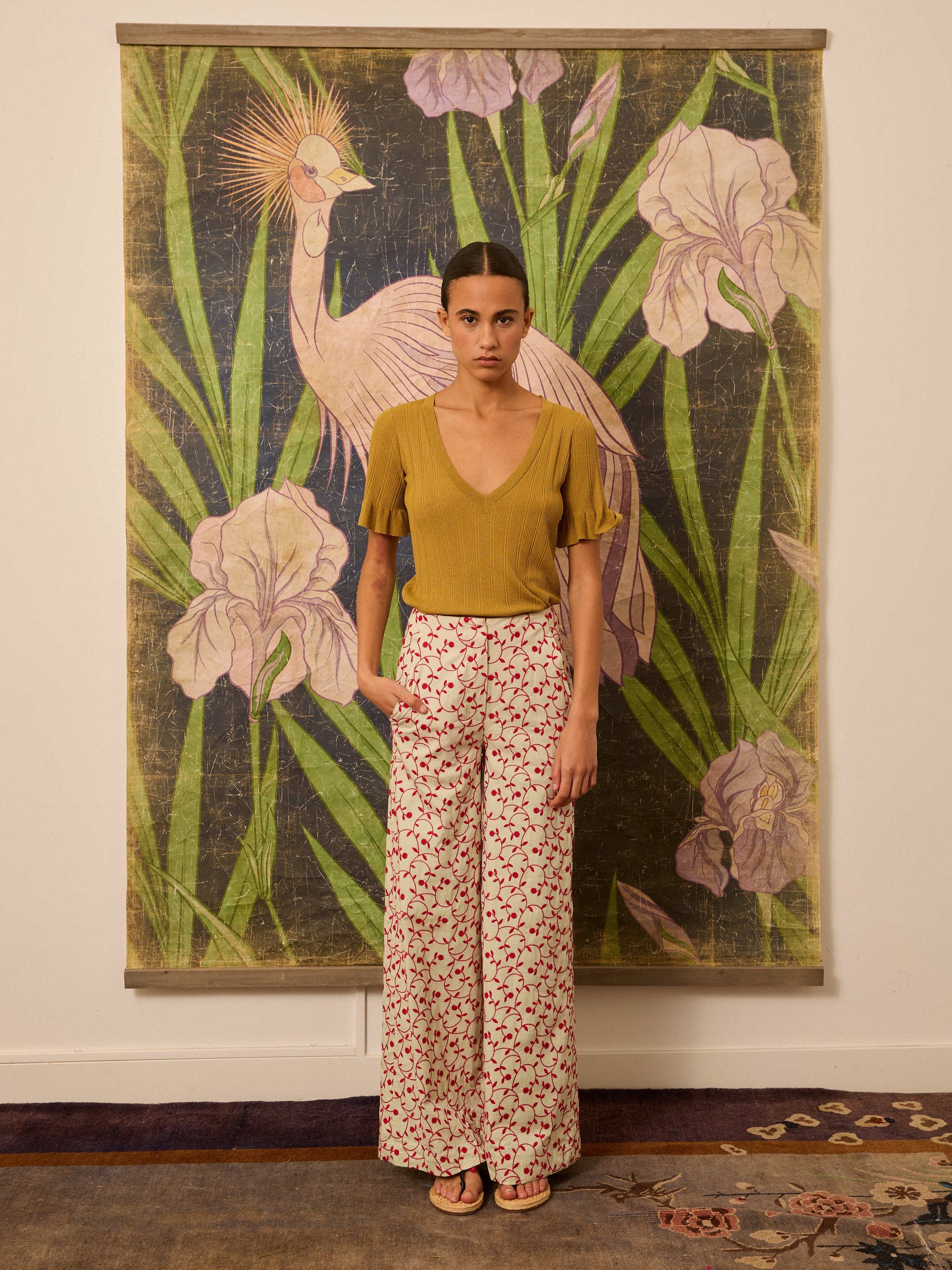 Pantalón verde agua con estampado a contraste de flores pequeñas bordadas en rojo. Es de estilo ancho con cremallera y corchete delantero