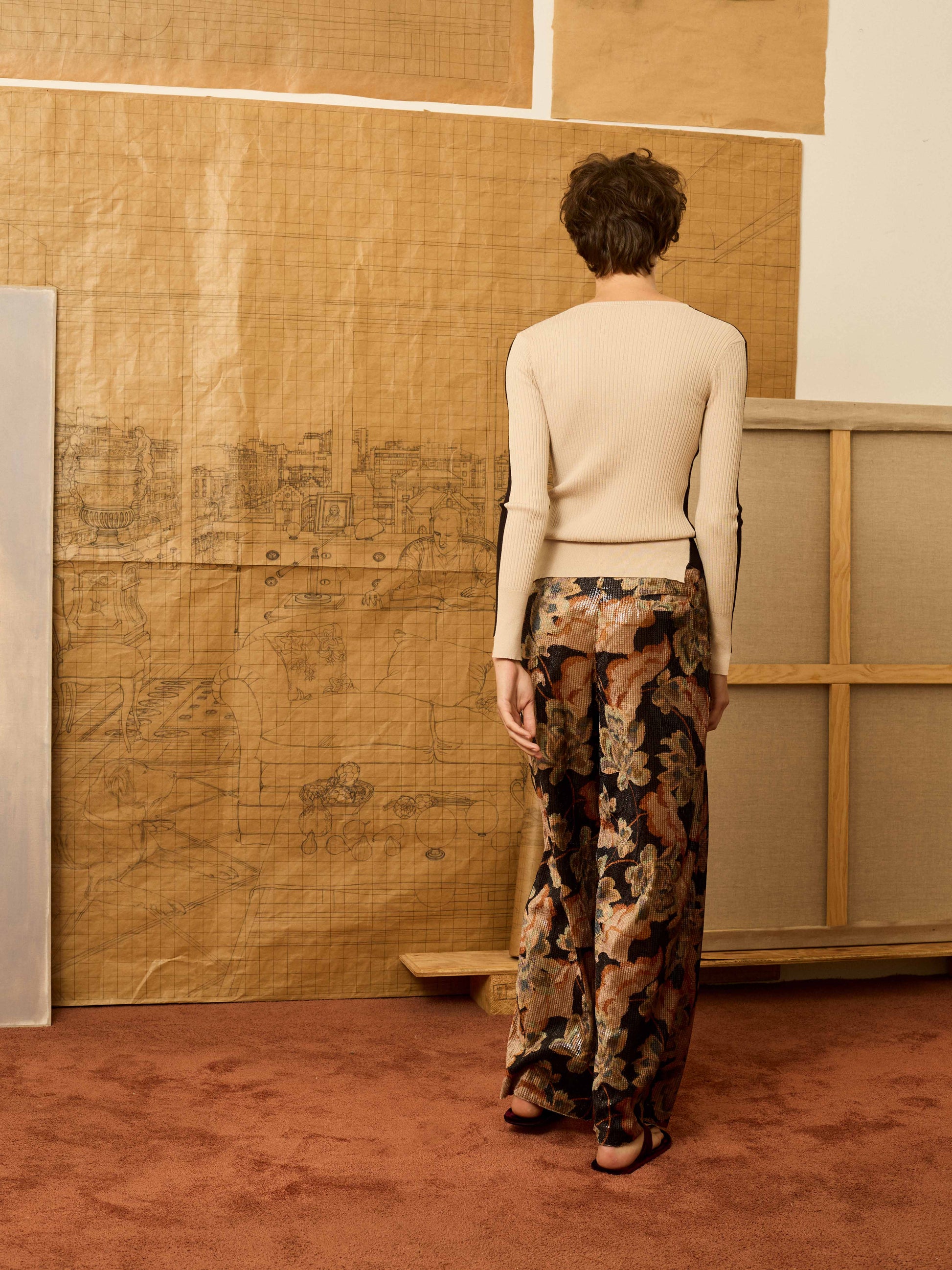 Pantalón de lentejuelas ancho con estampado de flores sobre fondo negro