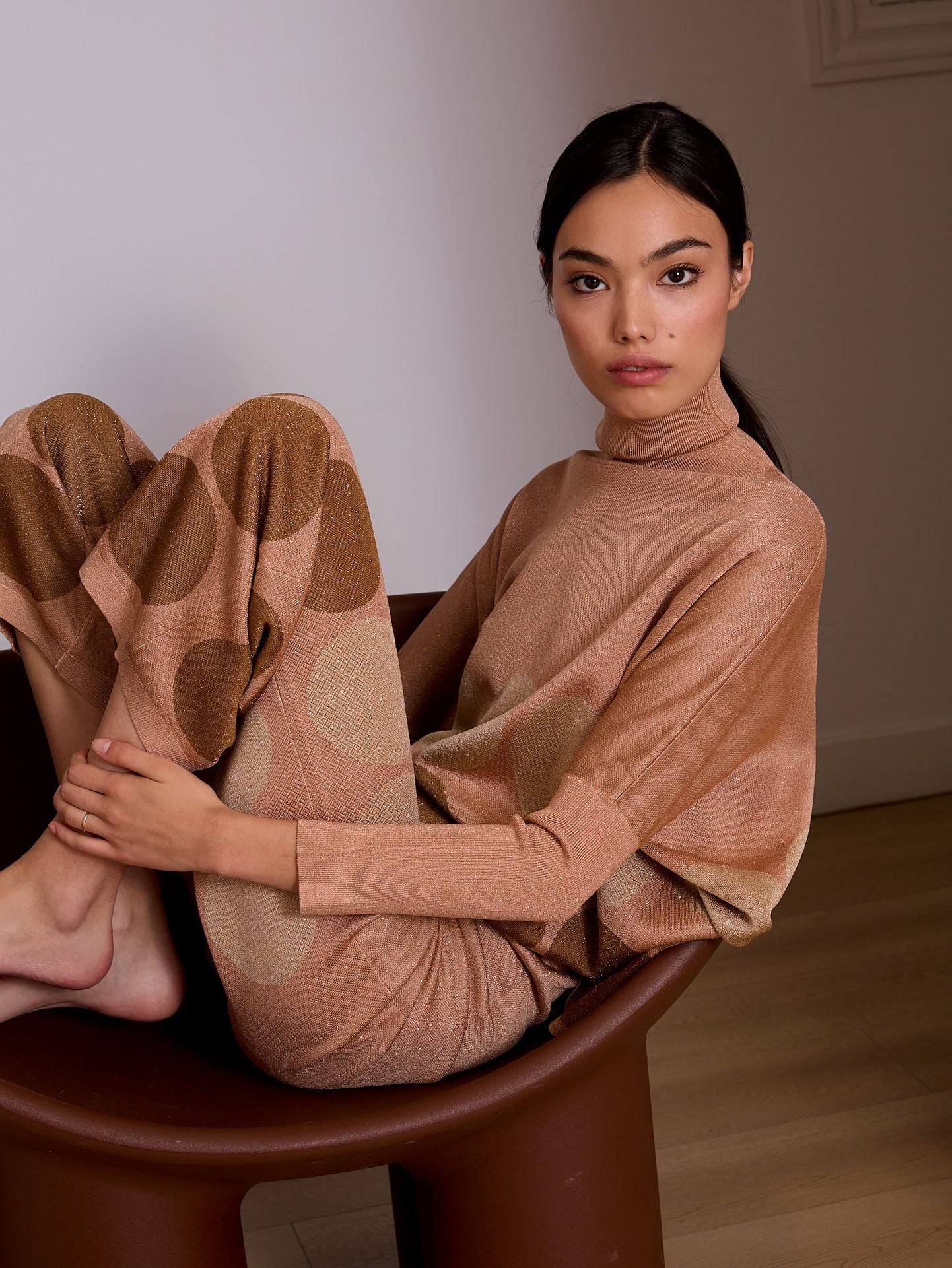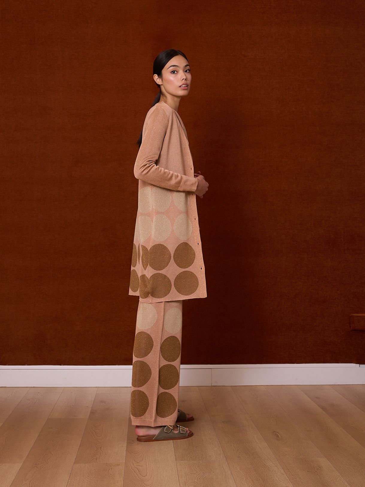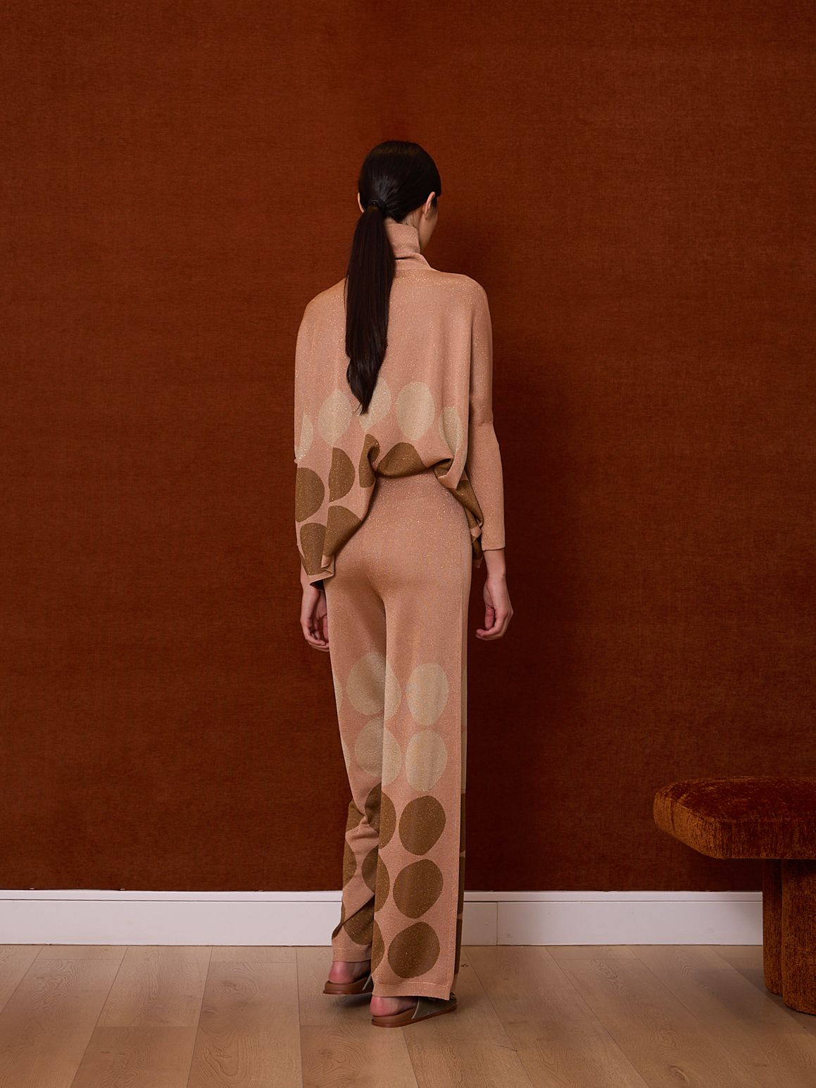Pantalón de lurex en color rosa con lunares en el bajo en tonos dorados y cobre