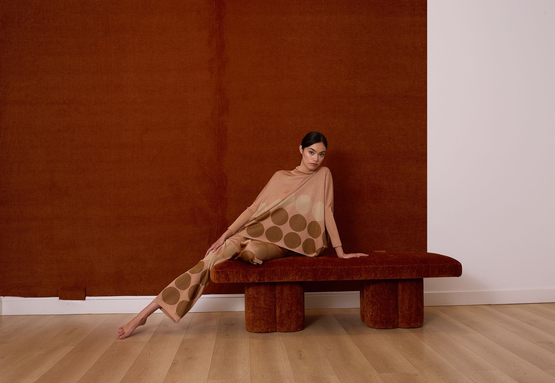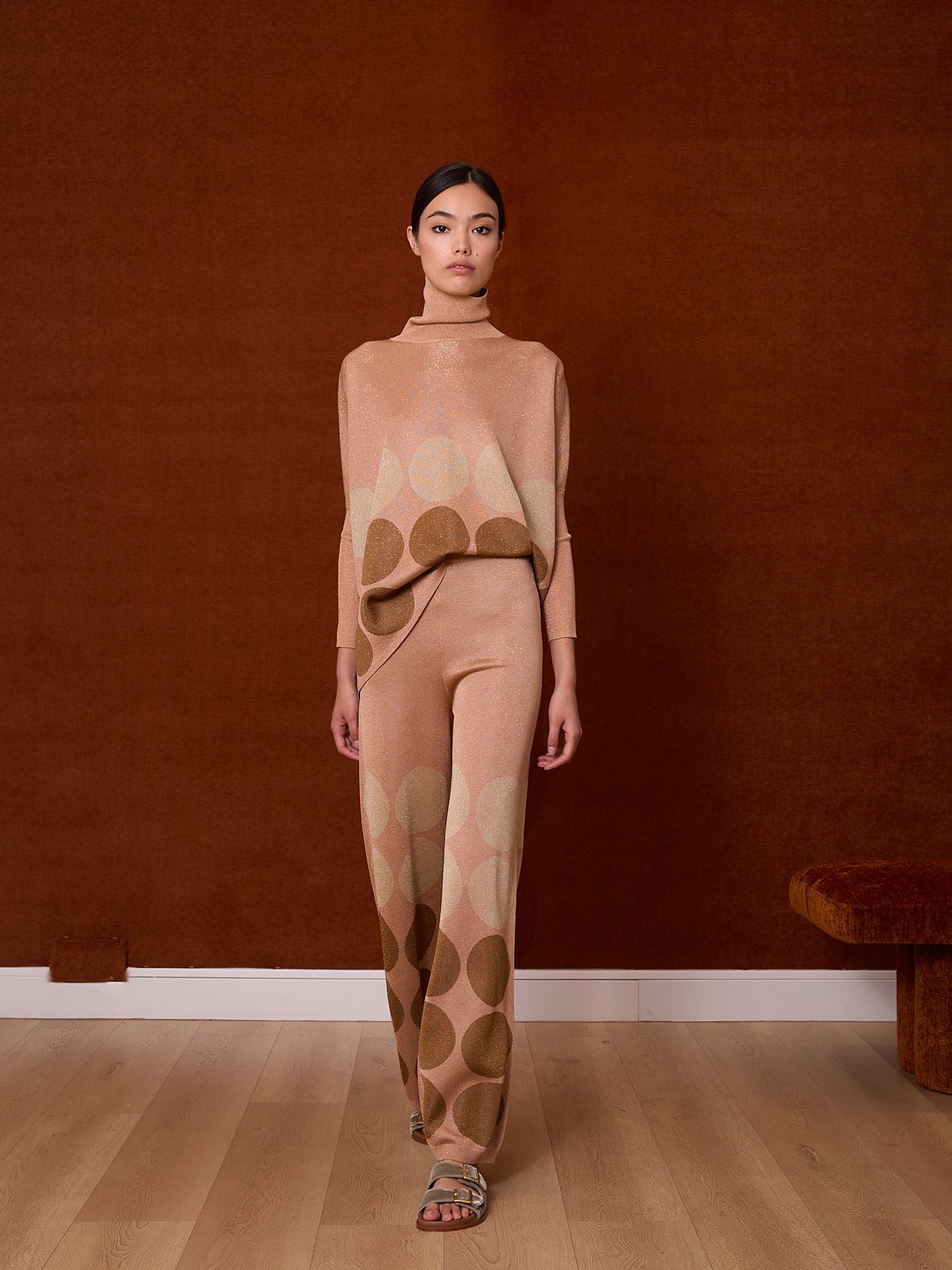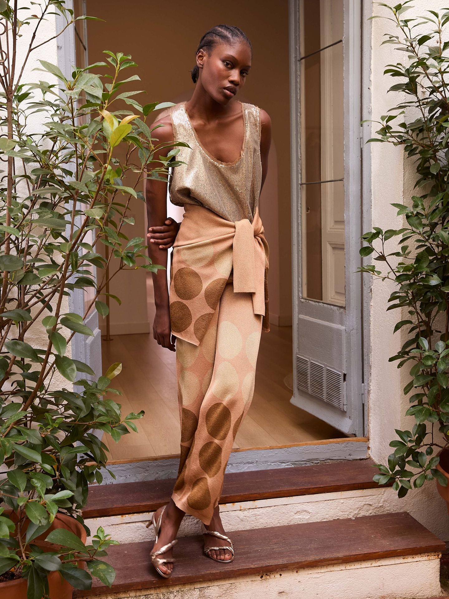 Pantalón de lurex en color rosa con lunares en el bajo en tonos dorados y cobre
