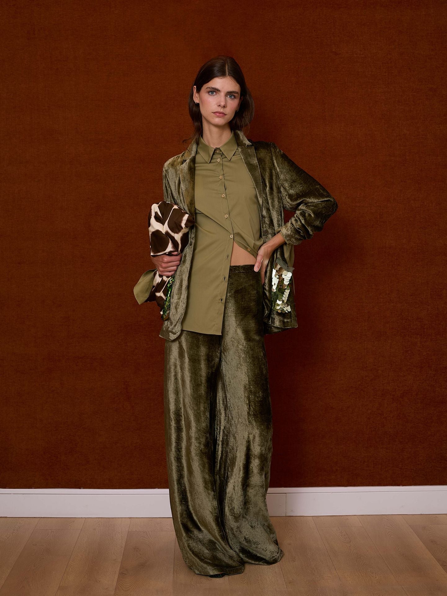 Pantalón ancho de terciopelo en color verde con botón y cremallera lateral. Tiene goma en cintura. Incluye cinturón de lentejuelas con ojal