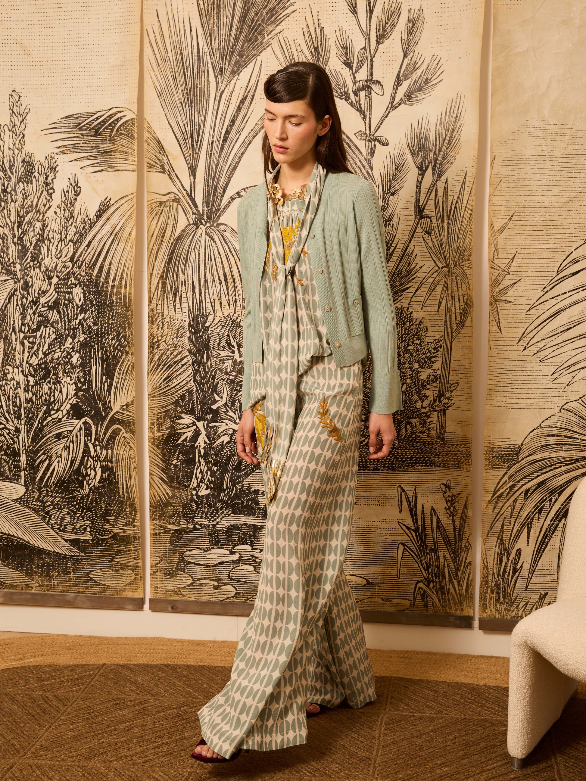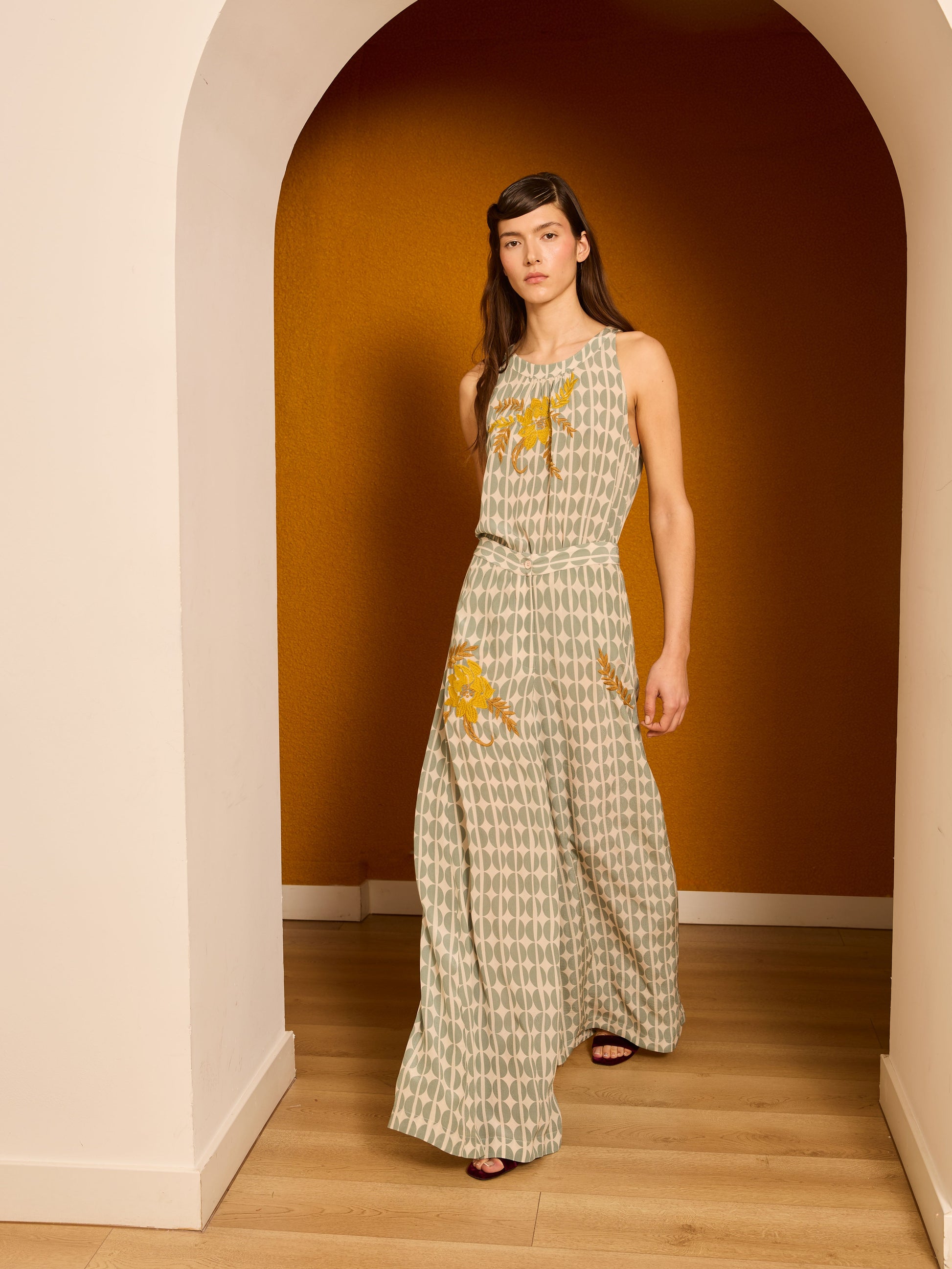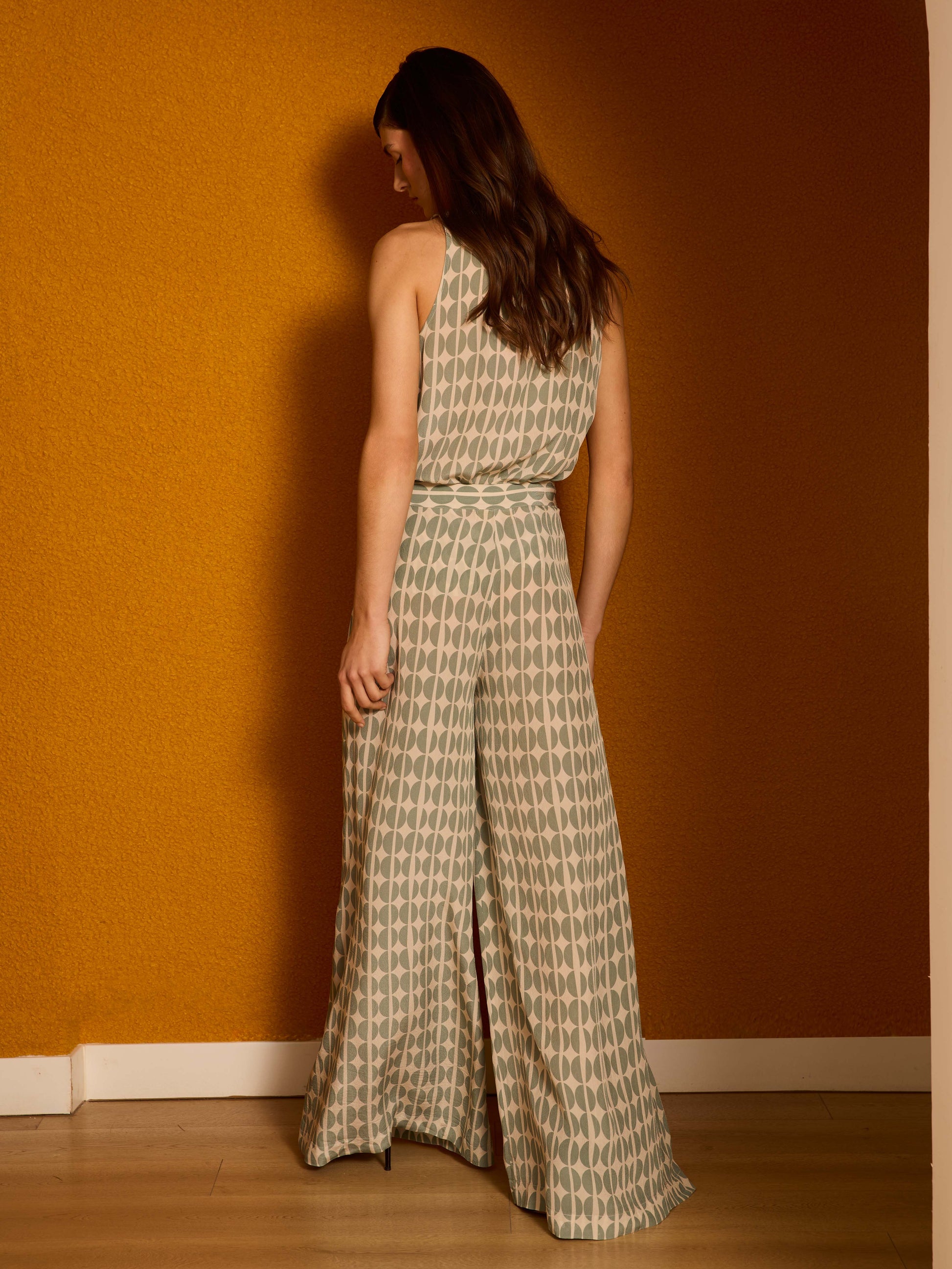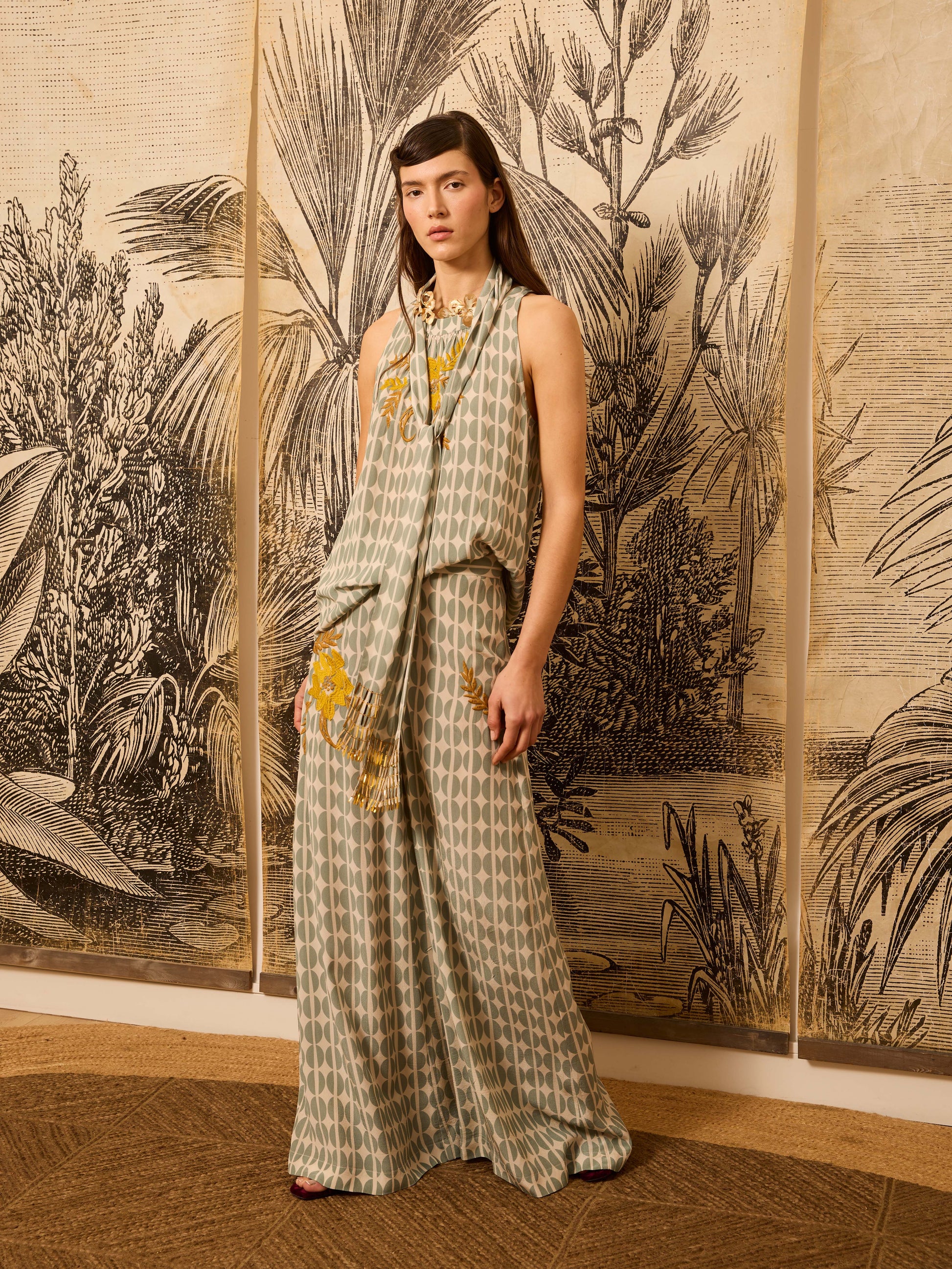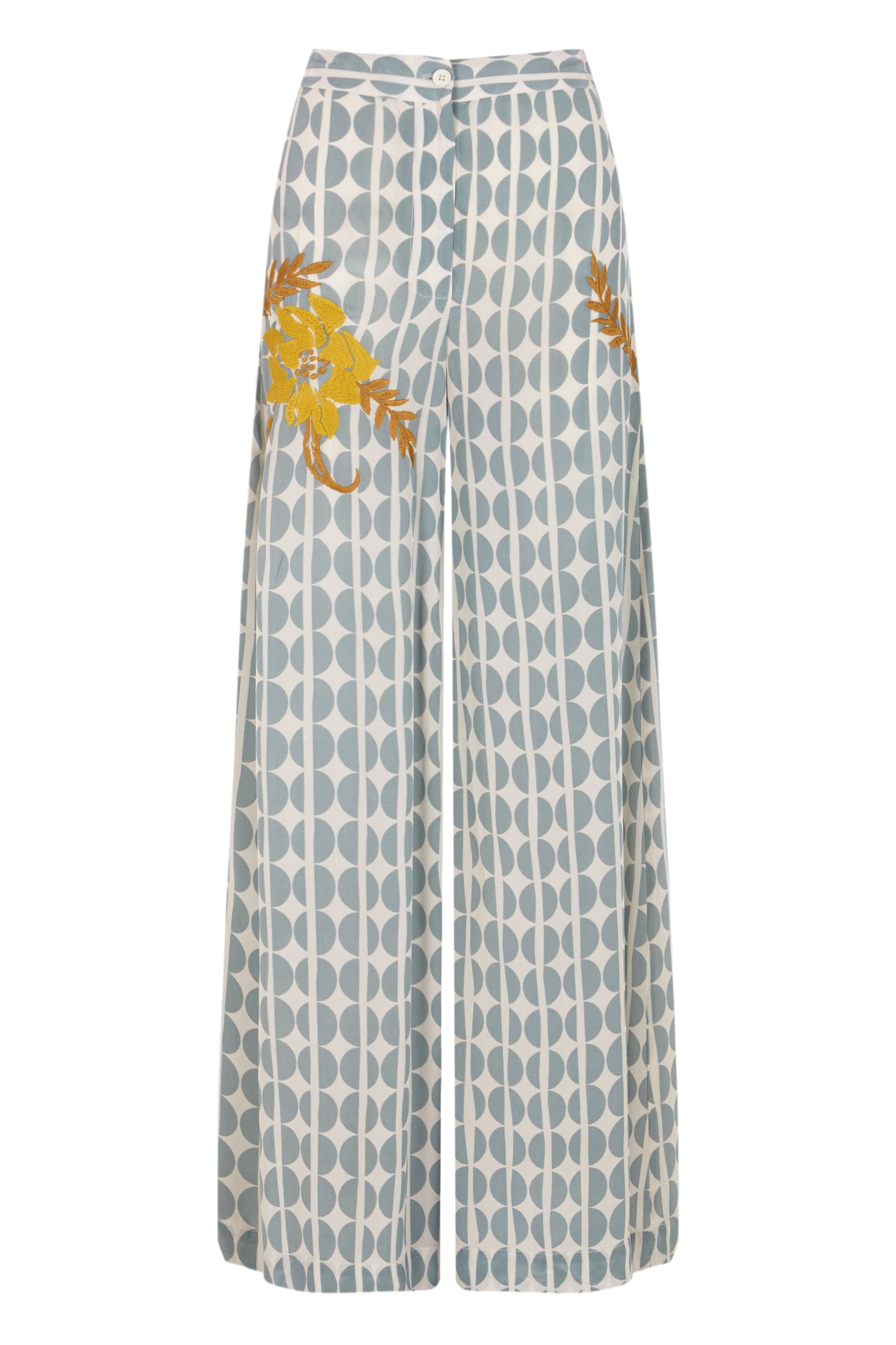 Pantalón palazzo estampado en tonos celeste con bordados en forma de flores en color verde