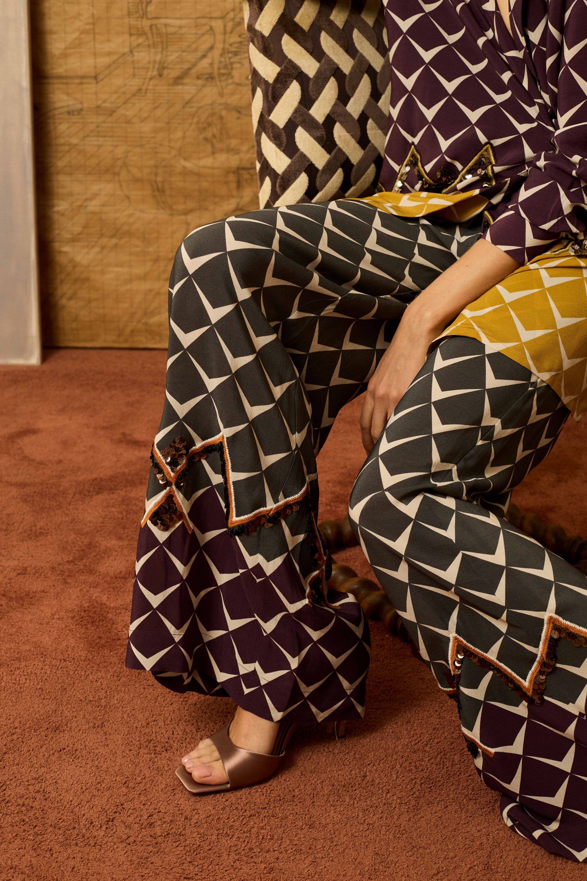 Pantalón palazzo de viscosa estampada con dibujo geométrico color gris antraticta, bajo en color a contraste y bordado de lentejuelas en zigzag