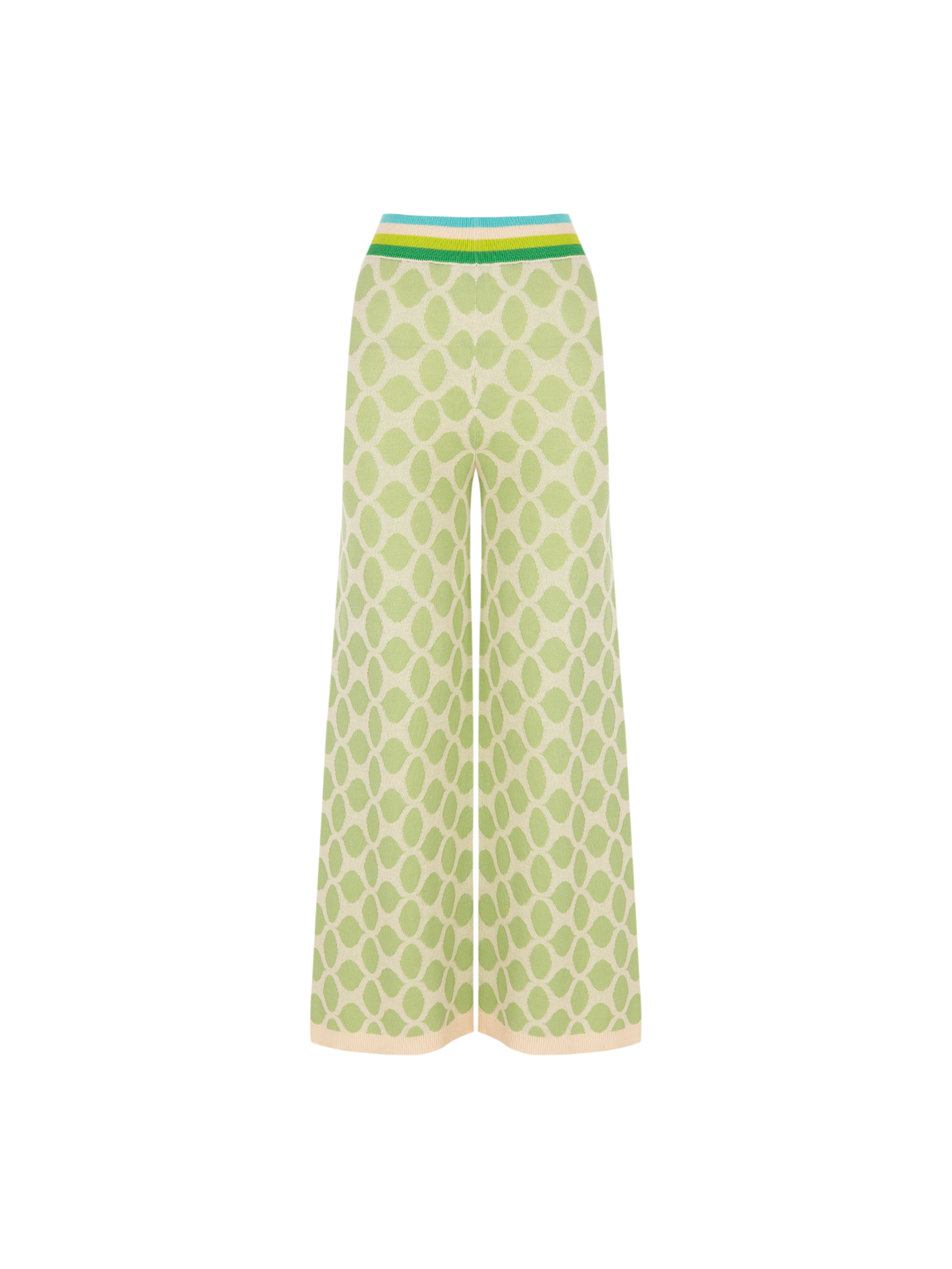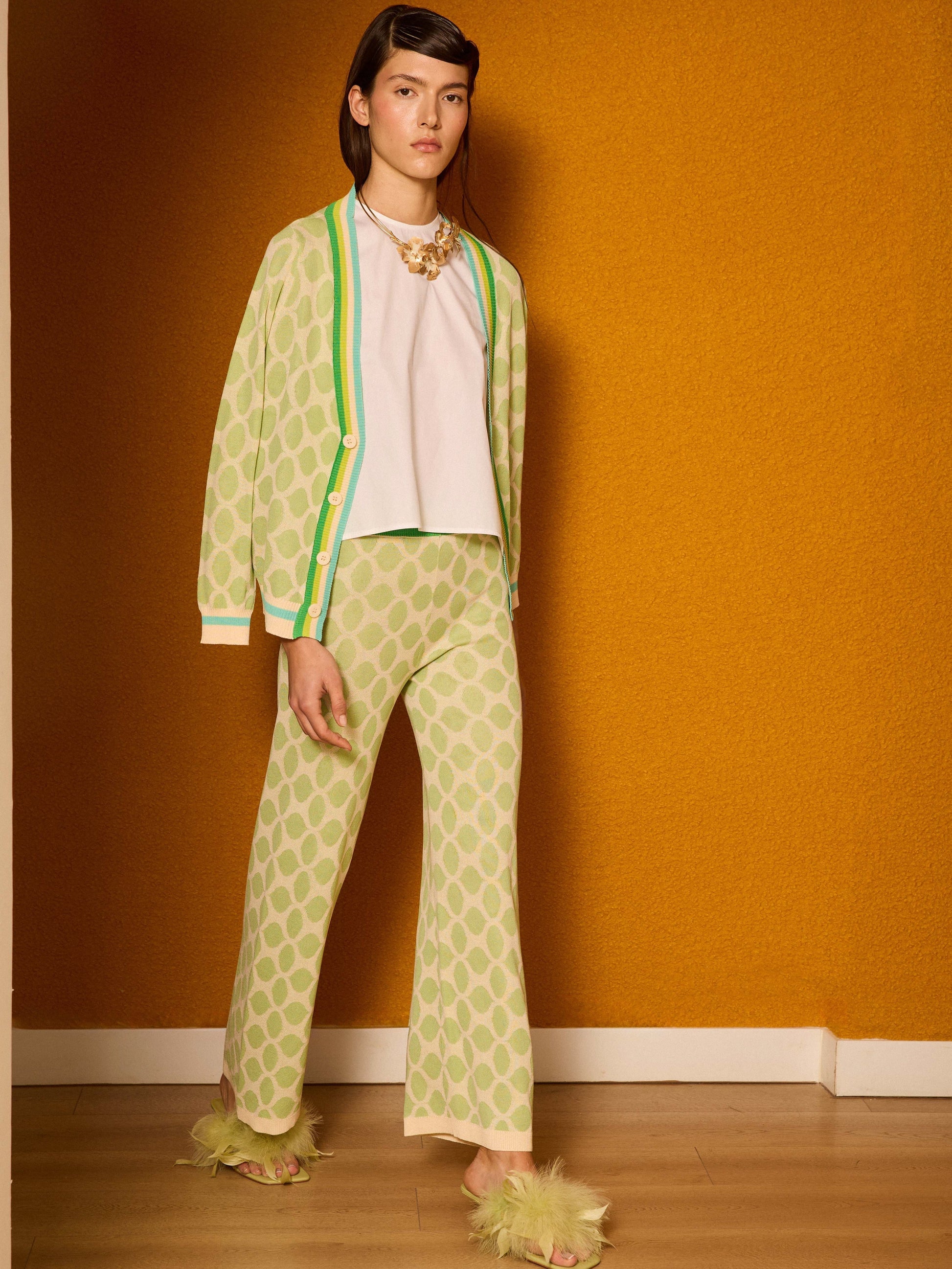 Pantalón de punto con intarsia de óvalos en color verde sobre color crudo. Detalle de líneas a contraste en cinturilla