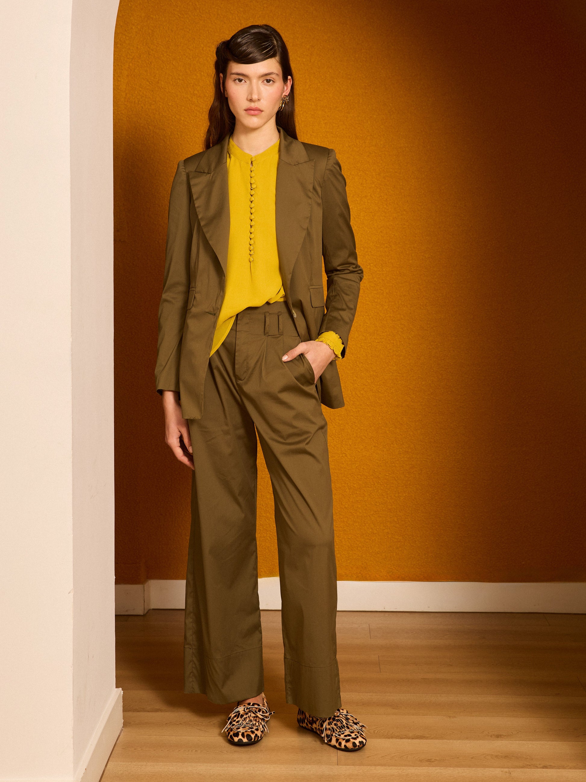 Pantalón de popelín de algodón en color kaki estilo ancho, con cinturón. Hecho en España