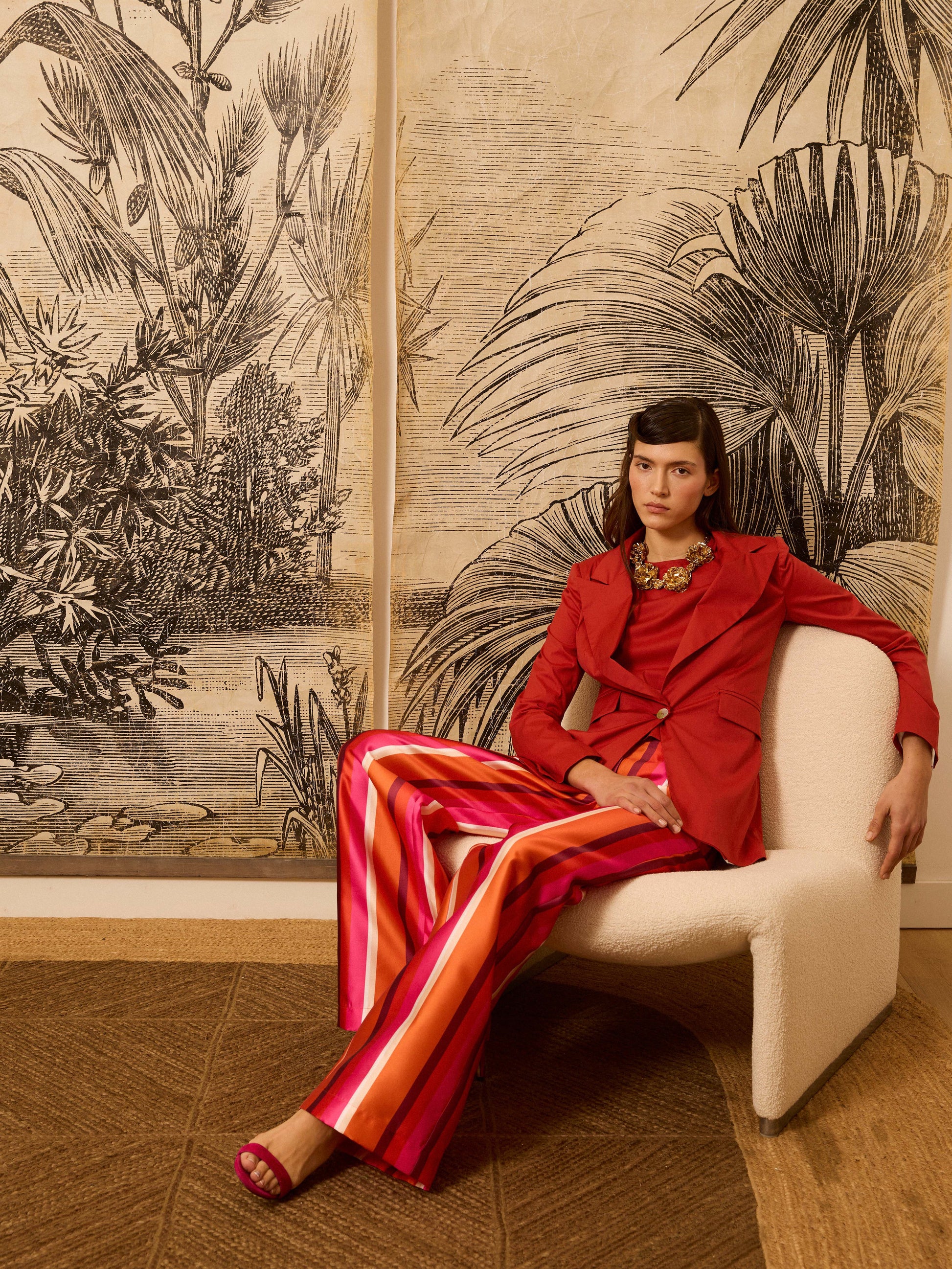 Pantalón palazzo confeccionado en mikado de rayas en tonos rojos. Se cierra mediante cremallera. Hecho en España
