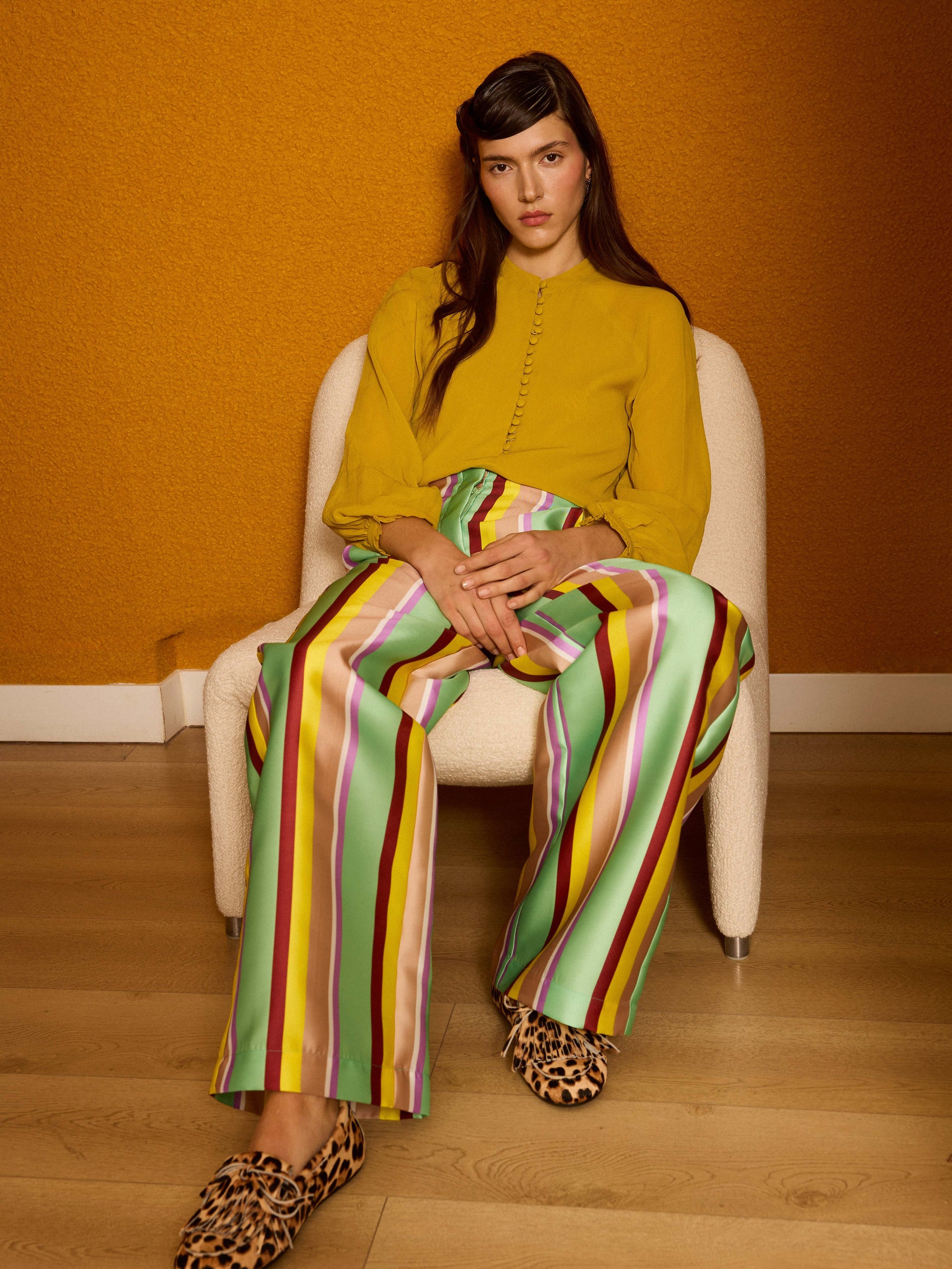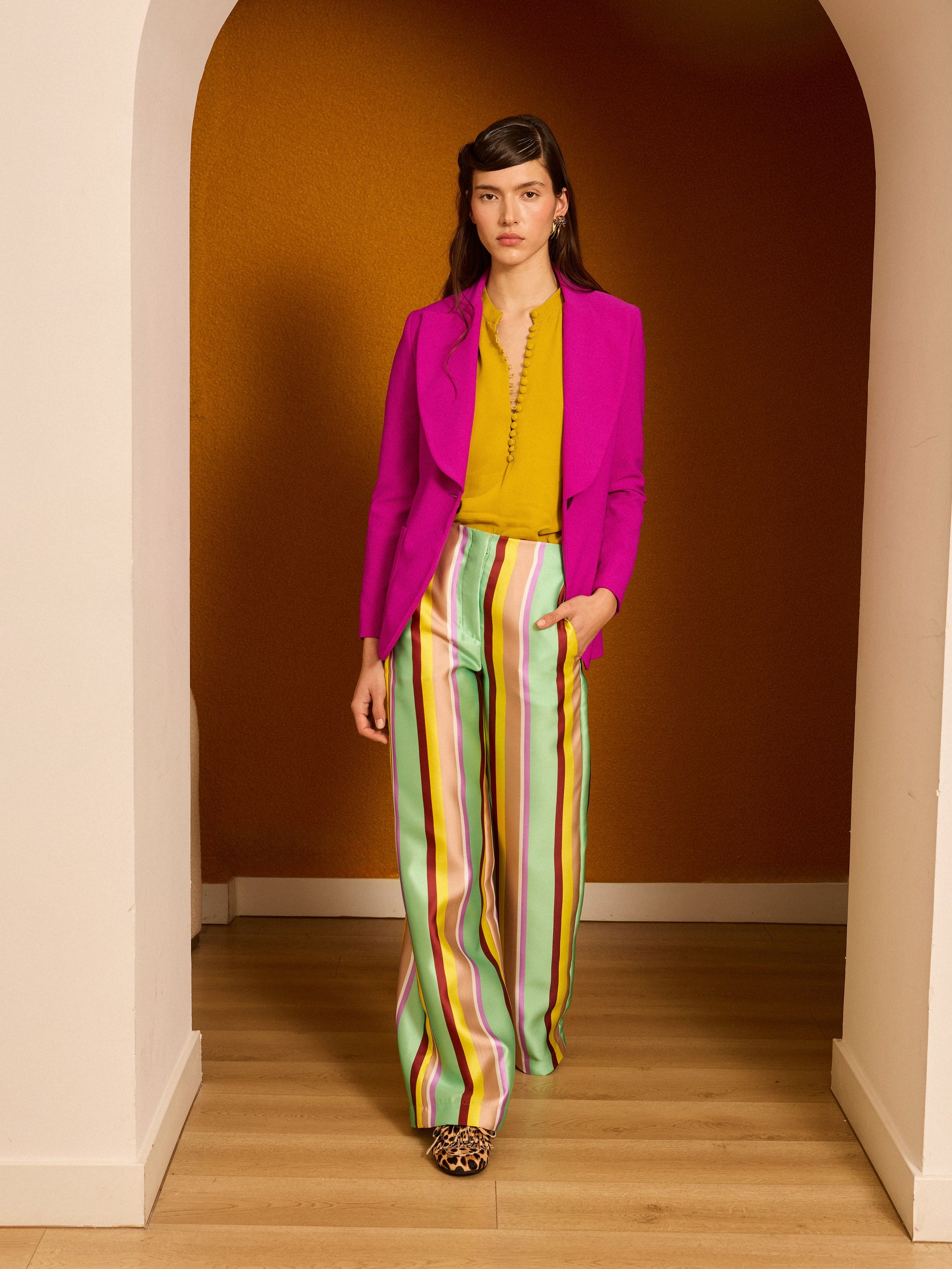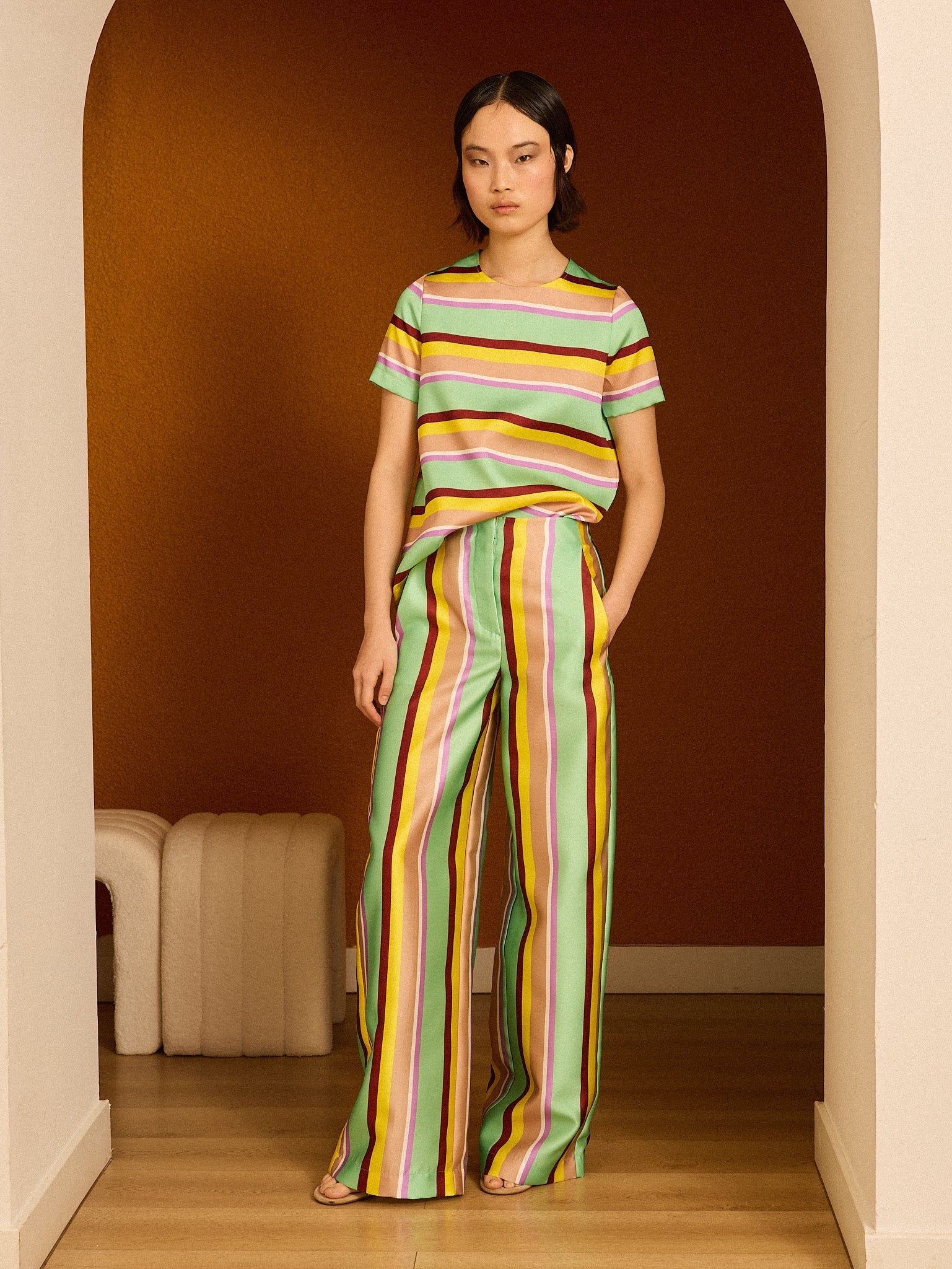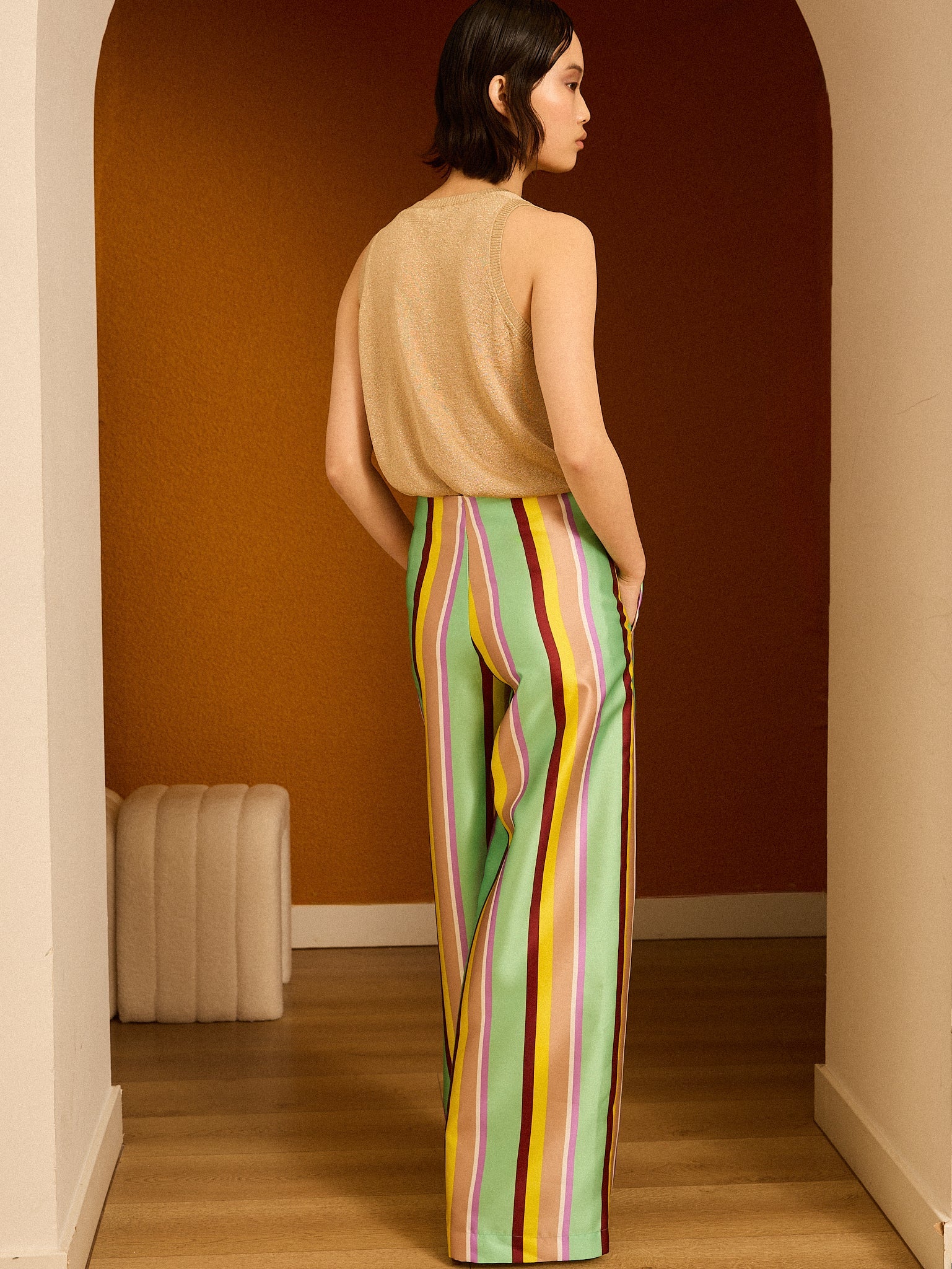 Pantalón palazzo confeccionado en mikado de rayas. Se cierra mediante cremallera. Hecho en España