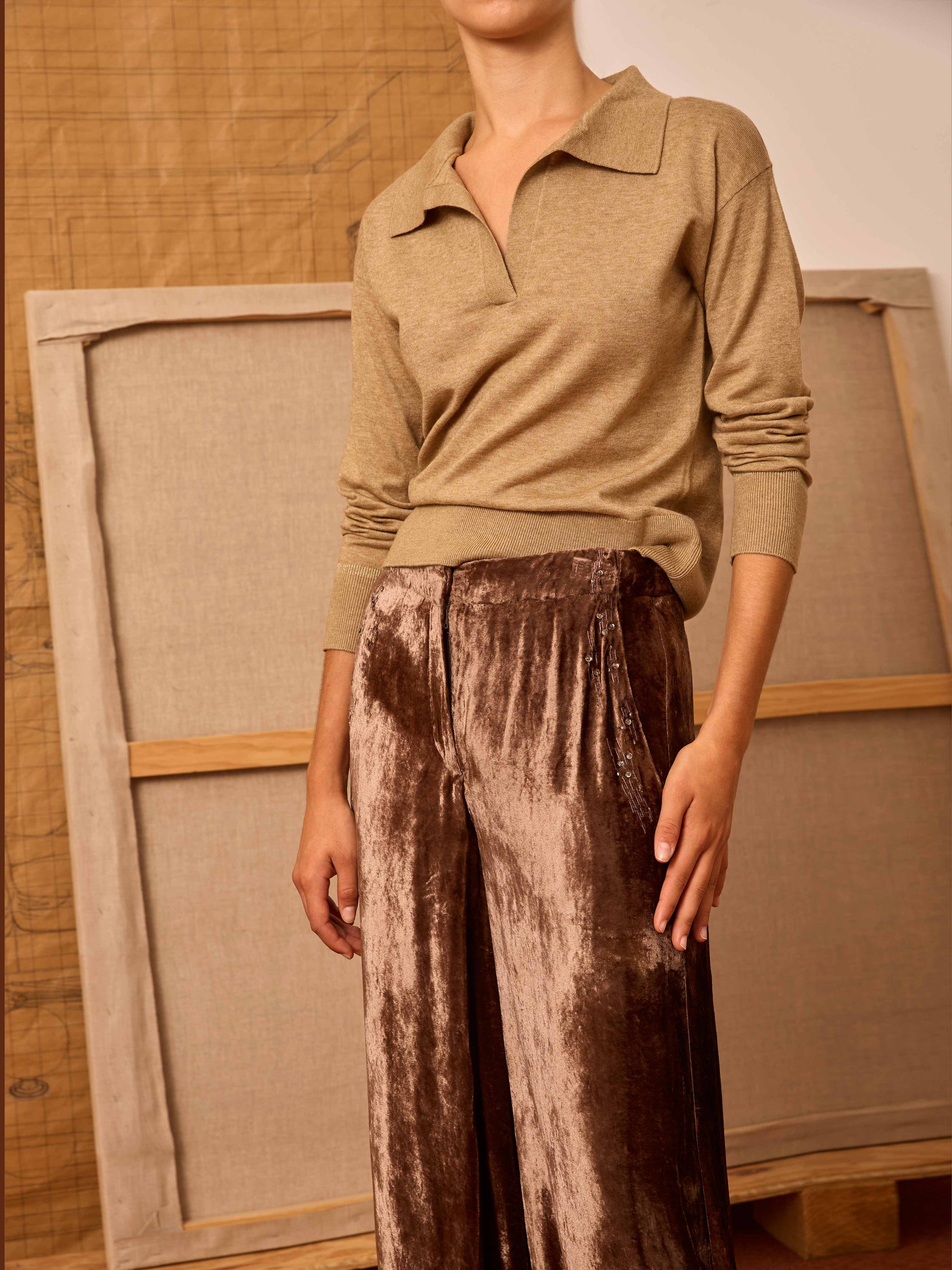 Pantalón de terciopelo en color topo con detalle de apliques de piedrecitas en bolsillo