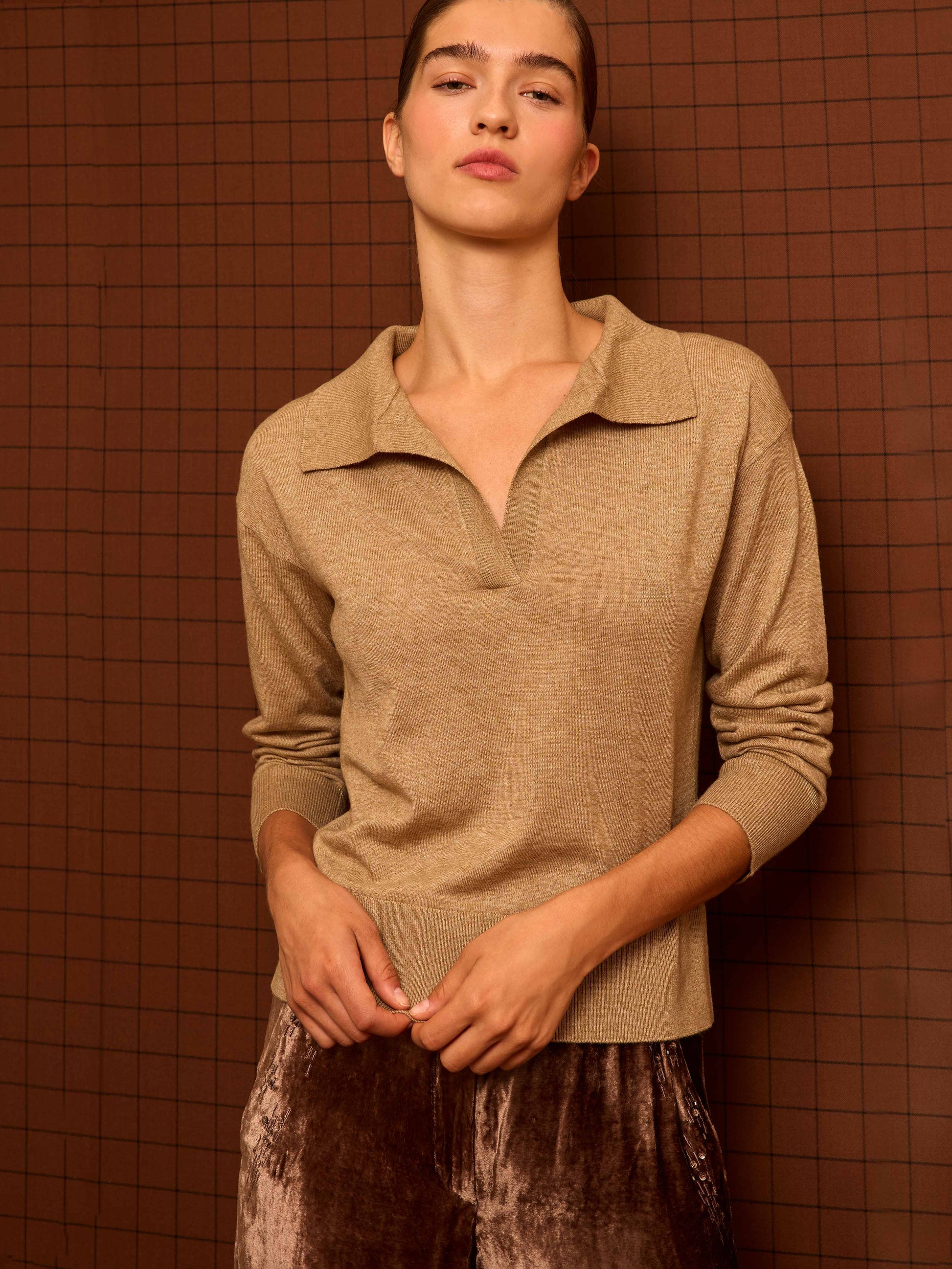 Jersey de punto con cuello solapa y manga larga en color topo. Tiene detalle de lurex al tono en el inicio del puño