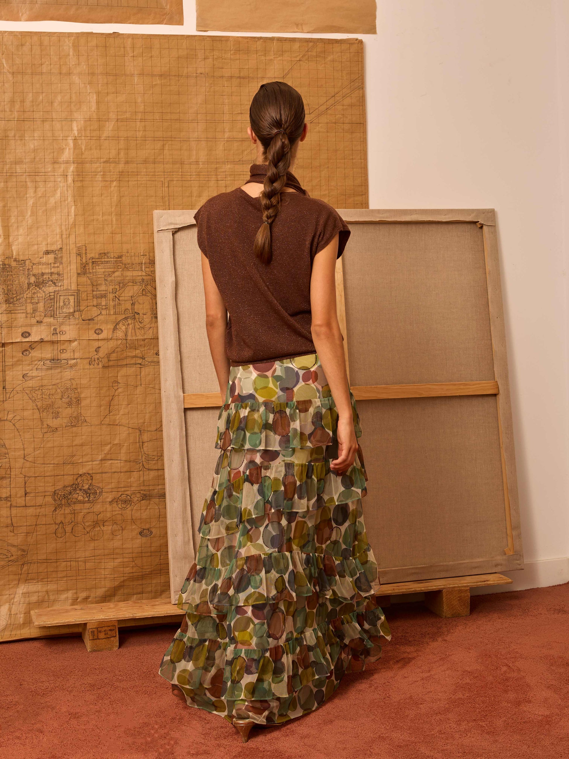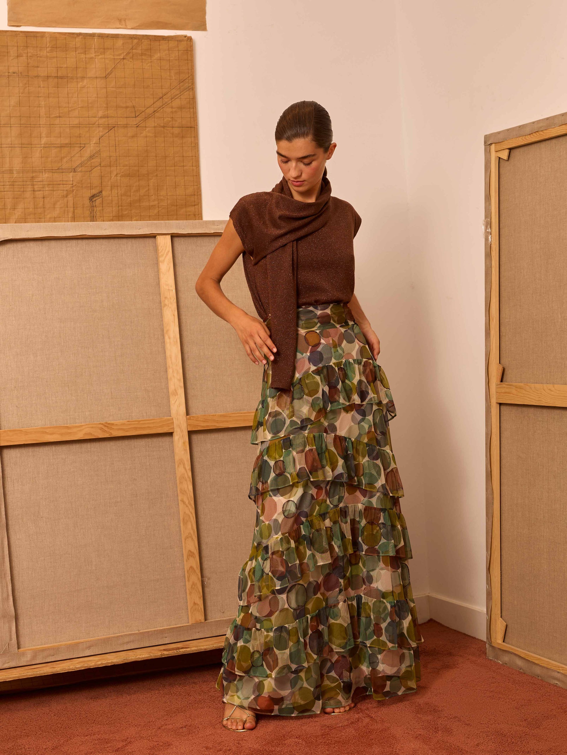 Top sin mangas marrón con lazada que nace en la costura del hombro derecho y manga larga en hilatura color beige con un sutil brillo