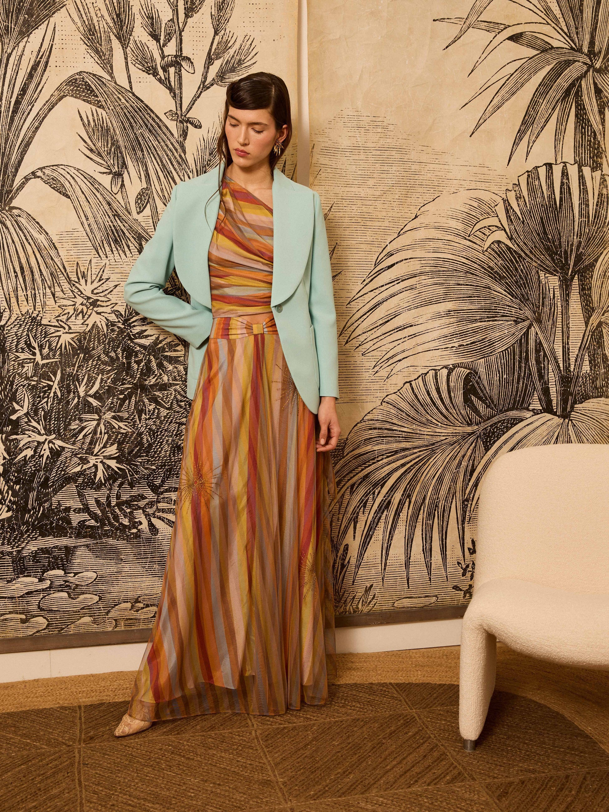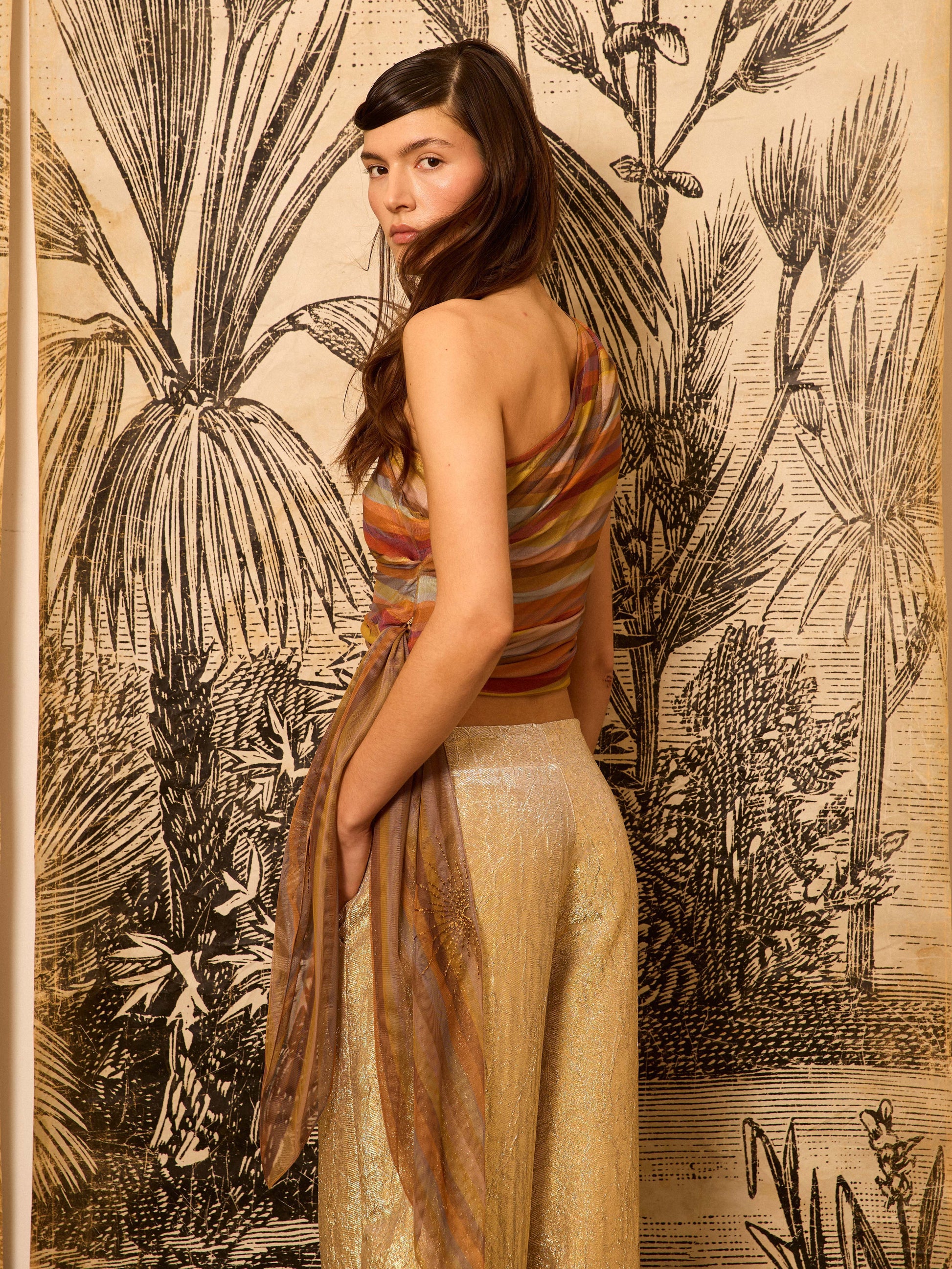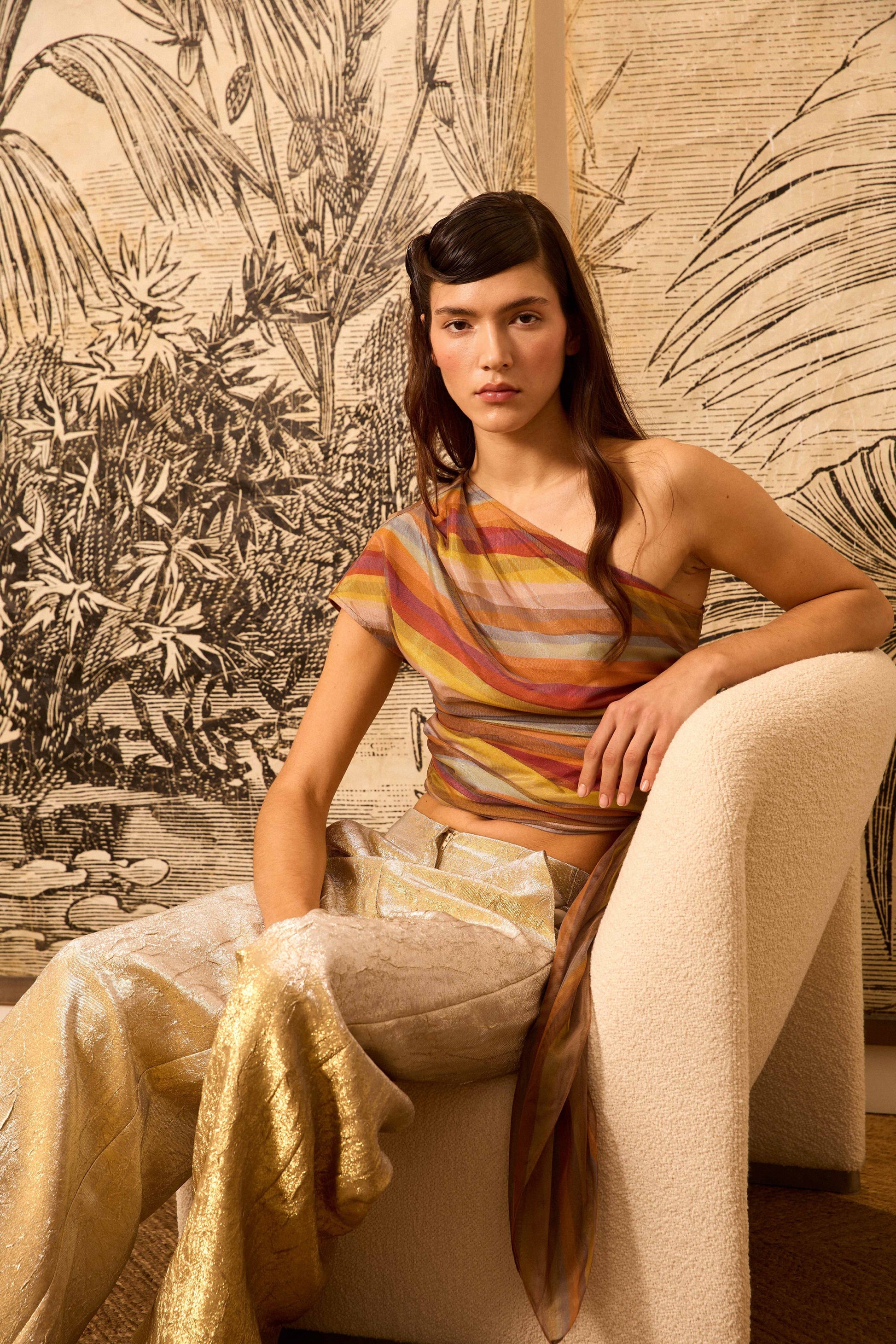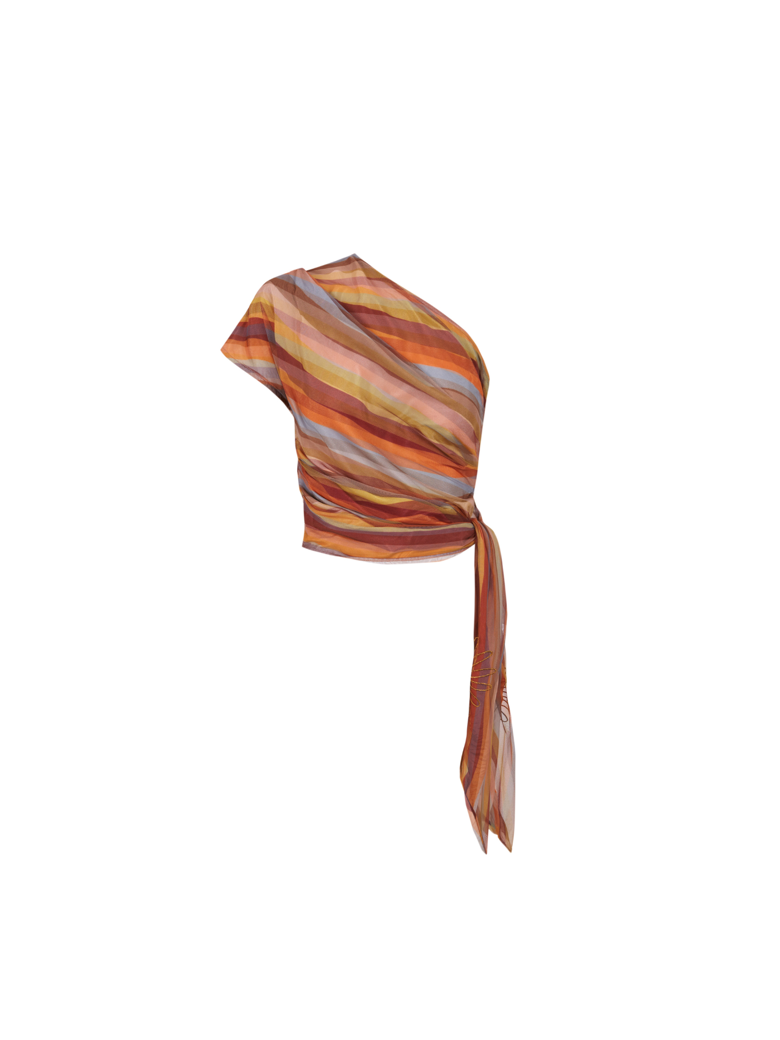 Top de tul asimétrico en estampado de rayas multicolor y lazada que cae por el lateral. Es de tirante ancho sobre el hombro