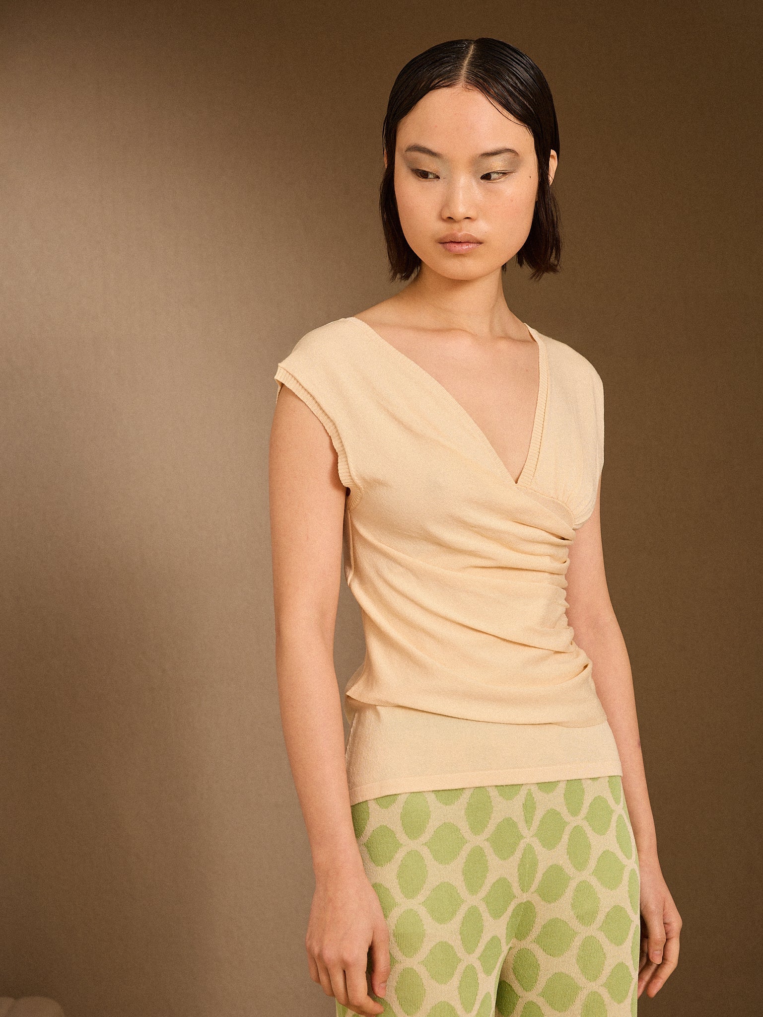 Top de punto viscosa en color vainilla con escote pico y sin mangas, es ajustado con un frunce lateral en cintura