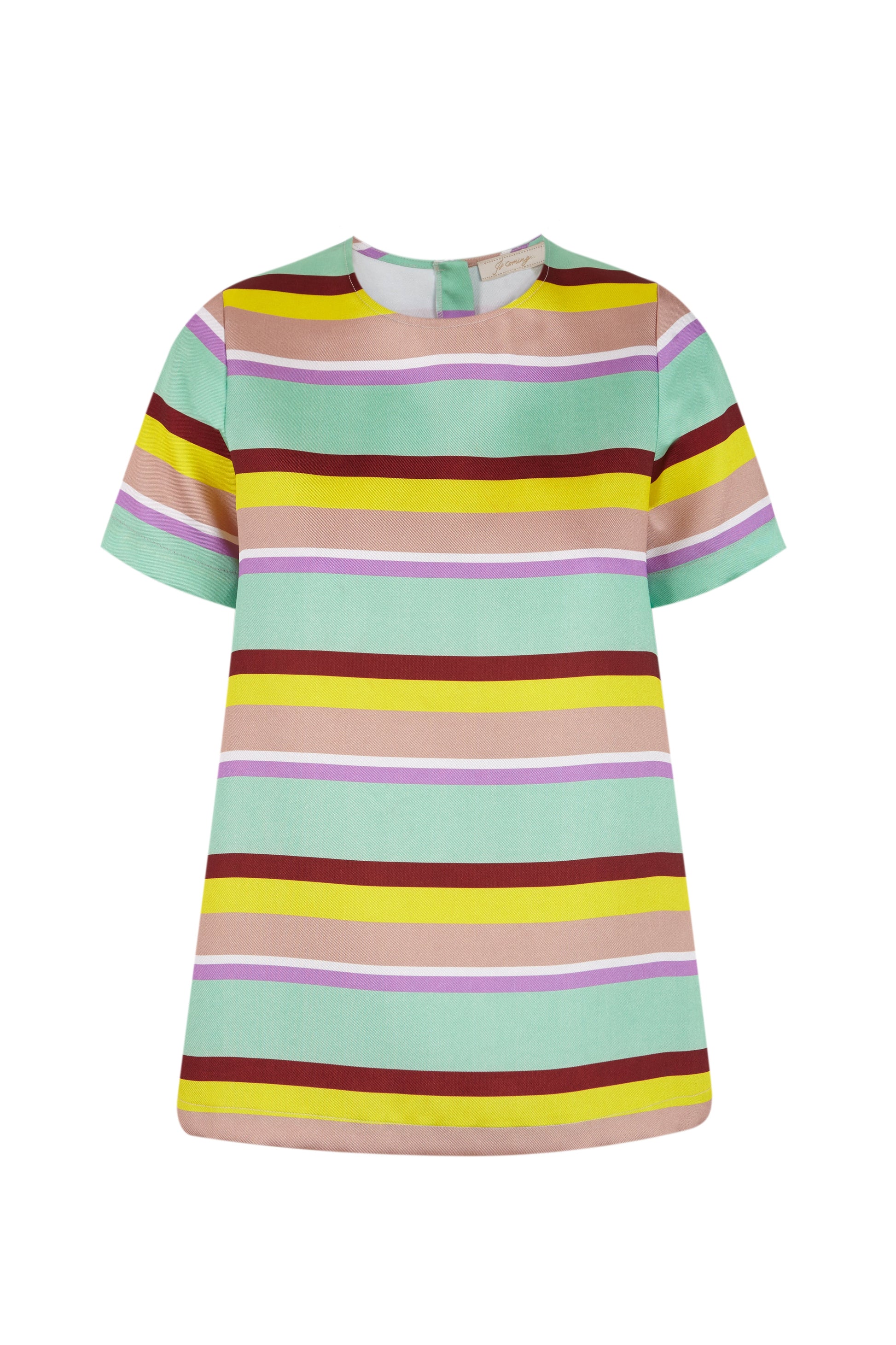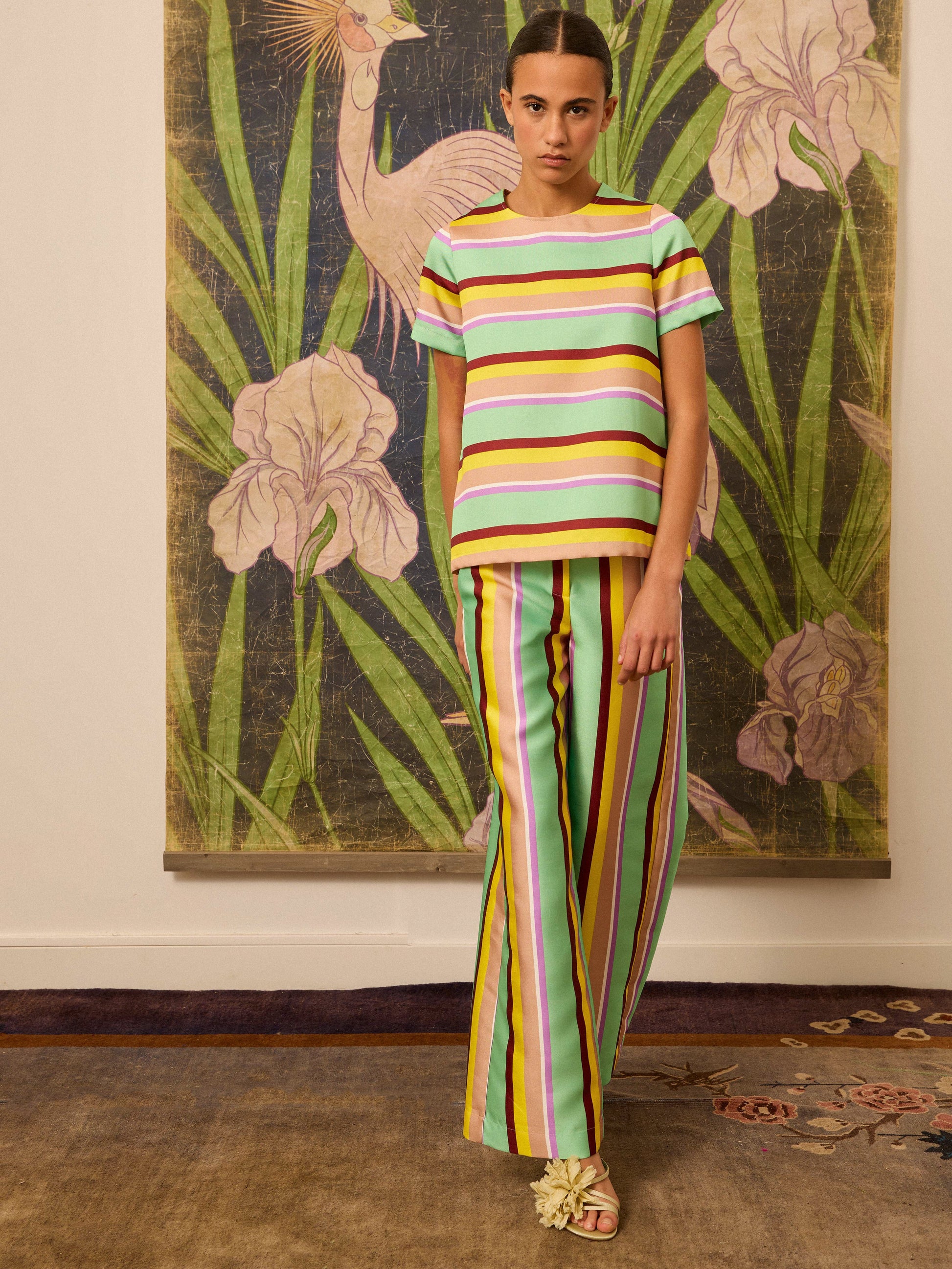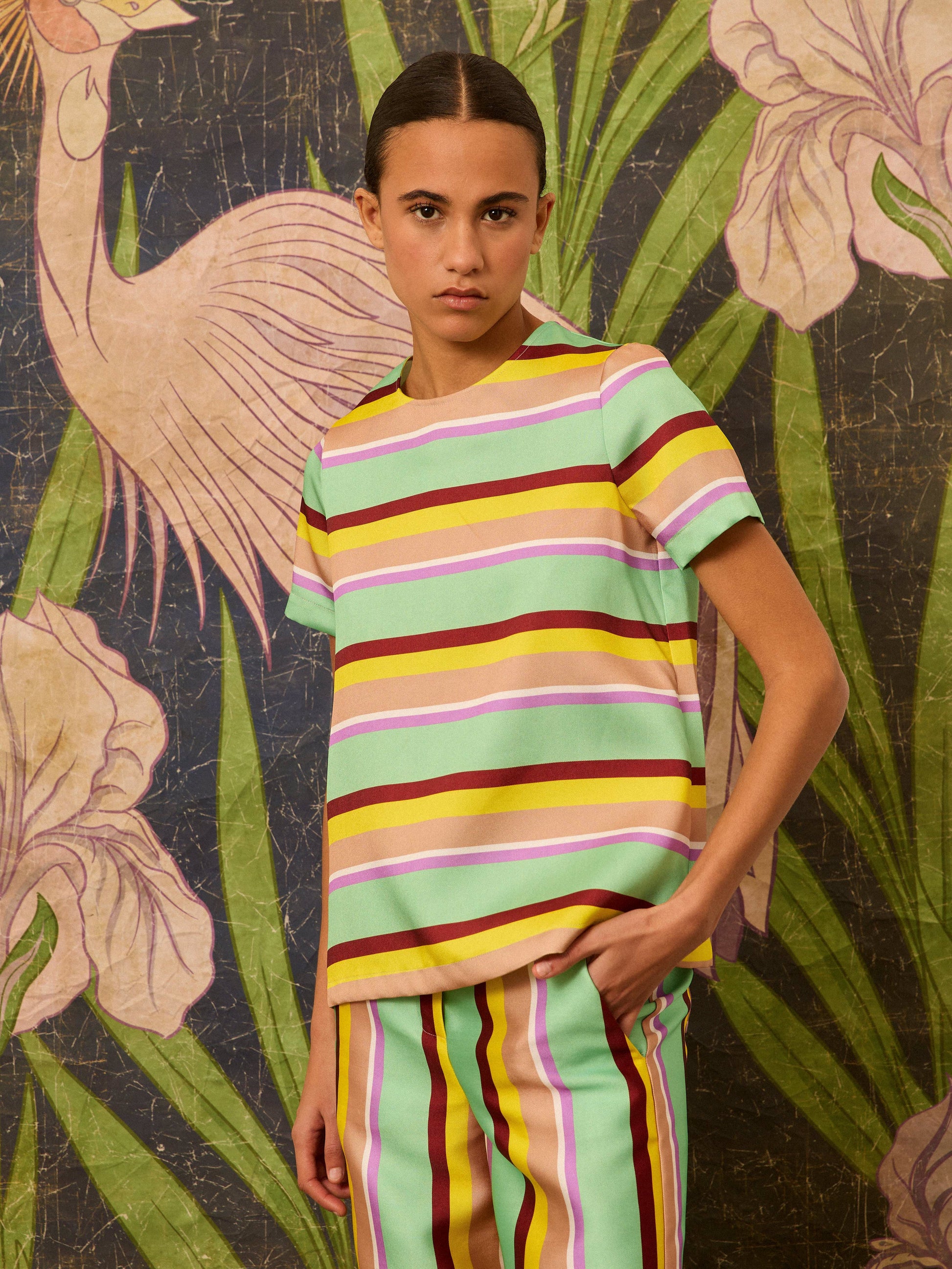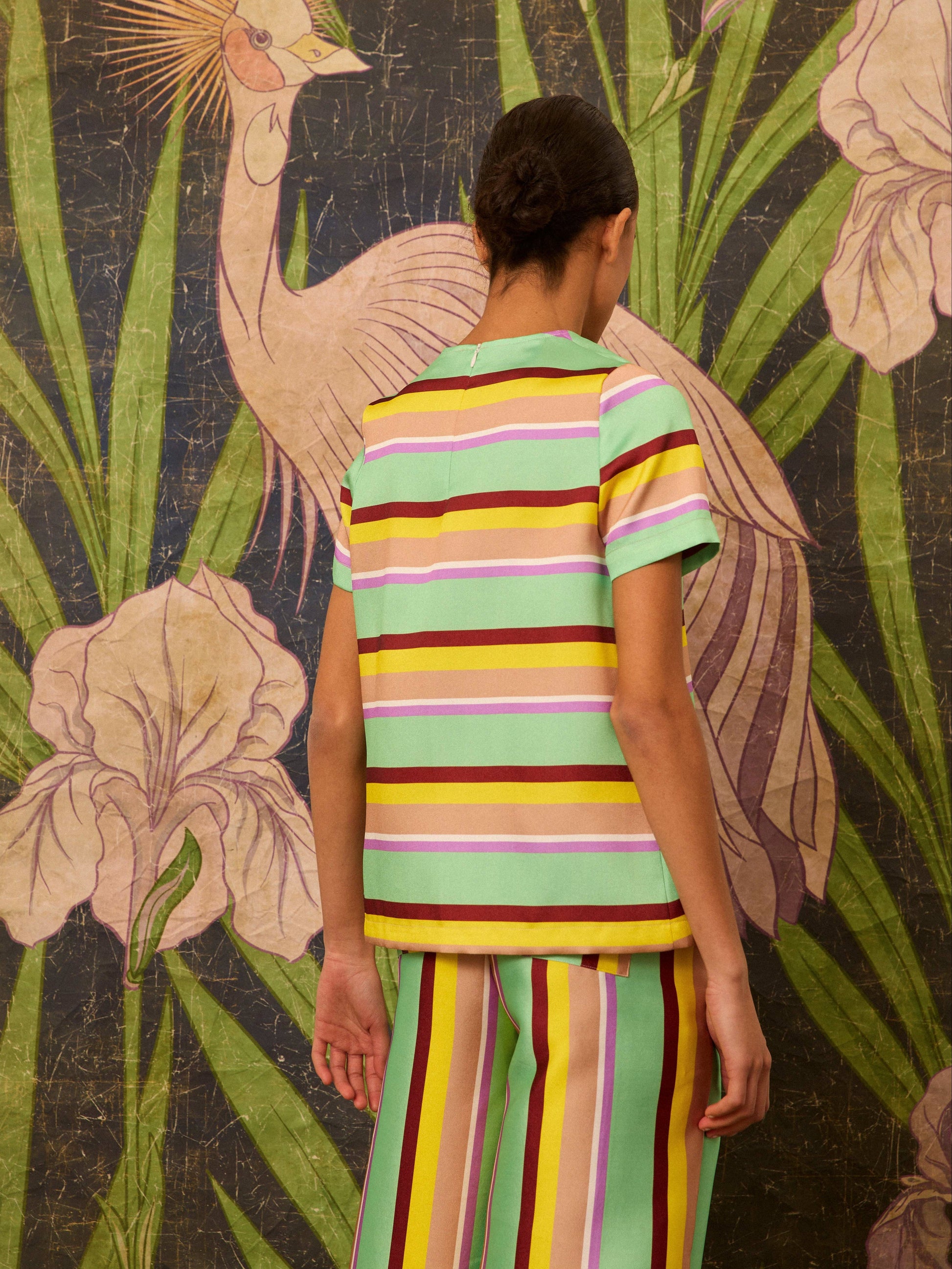 Top de cuello caja y manga corta en mikado de rayas verdes. Hecho en España