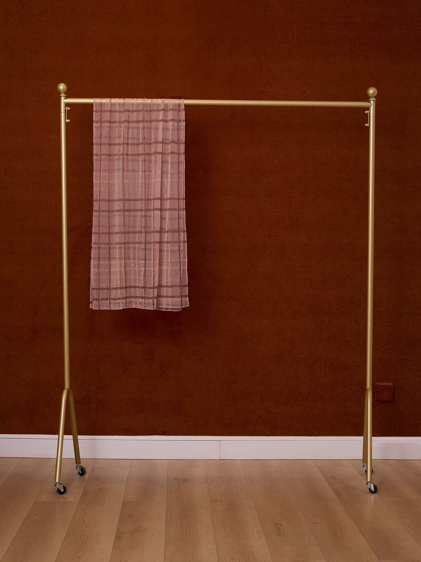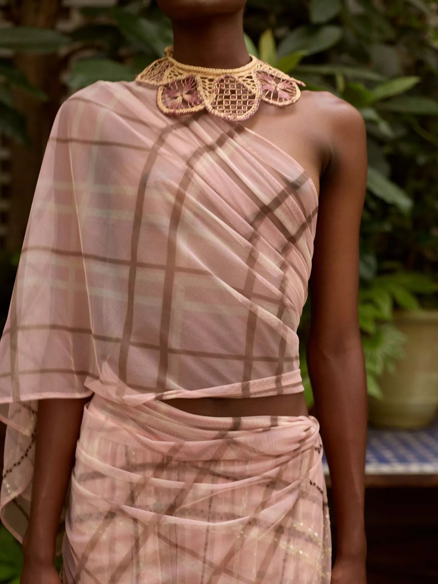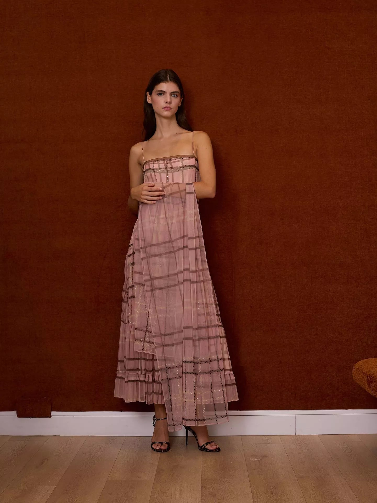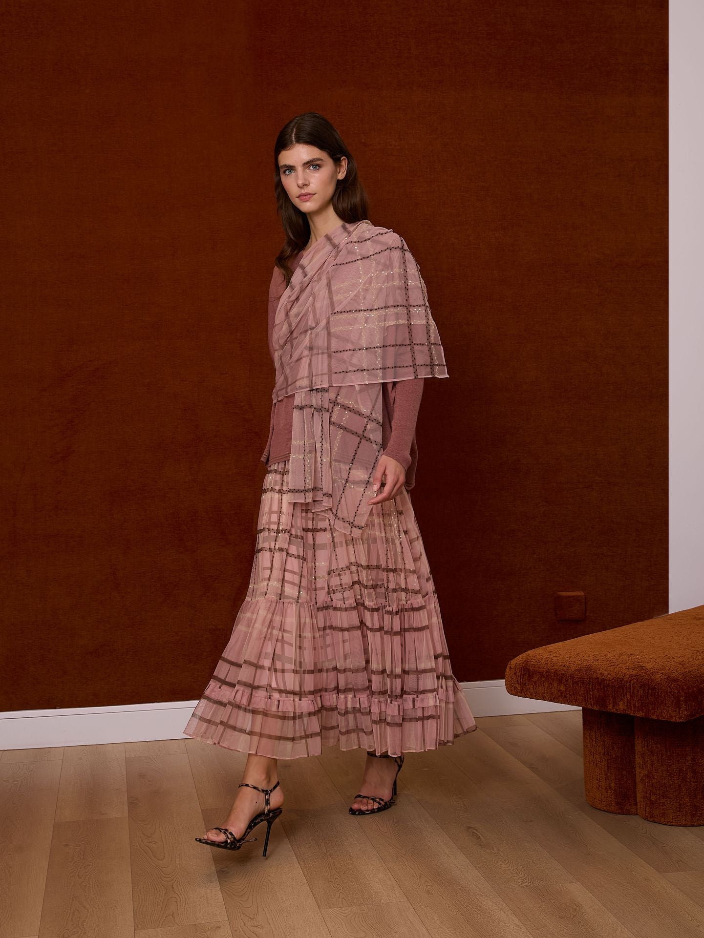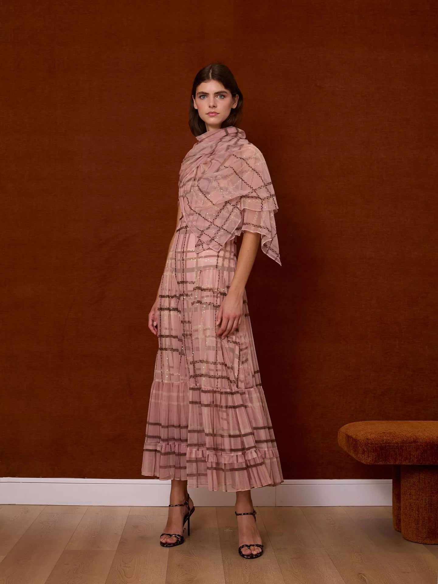 Chal de tul rosa estampado a cuadros y bordado con lentejuelas.