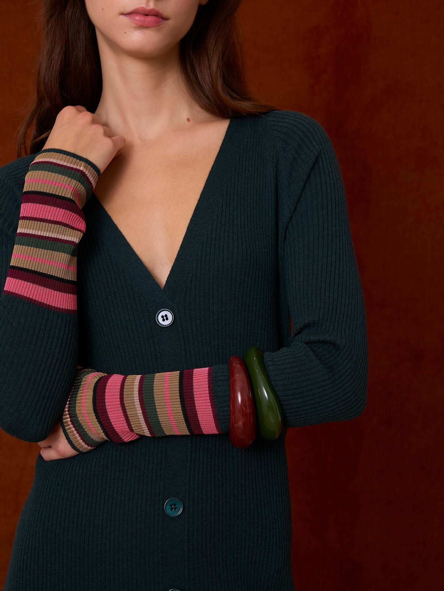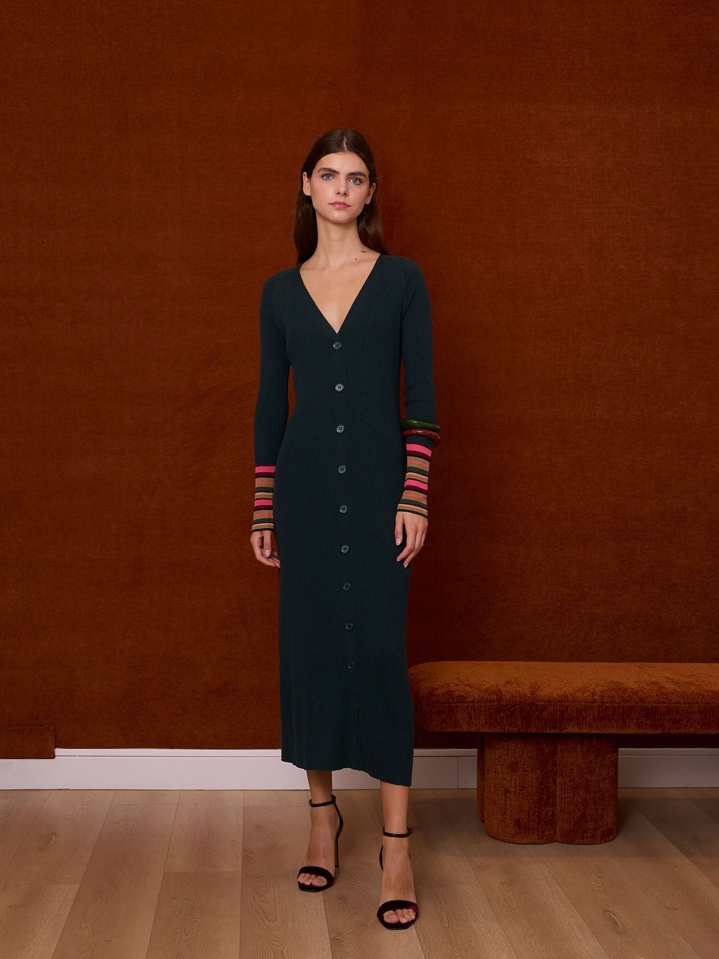 Vestido de punto inglés de manga larga abotonado con detalle de rayas multicolor en los puños