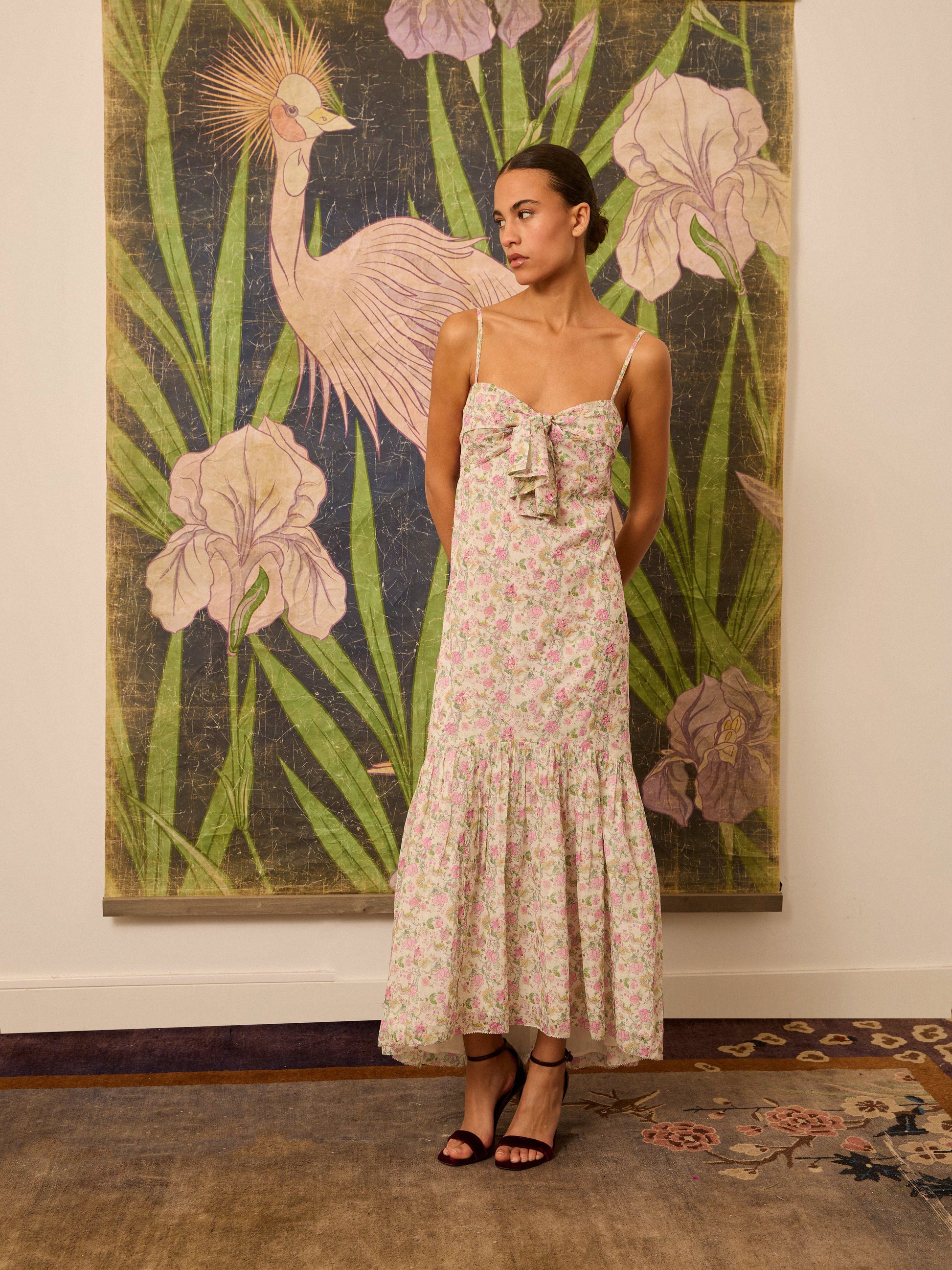 Vestido palabra de honor con lazada en el pecho y corte sirena. Delicado estampado de flores con detalles de lentejuelas rosas bordadas