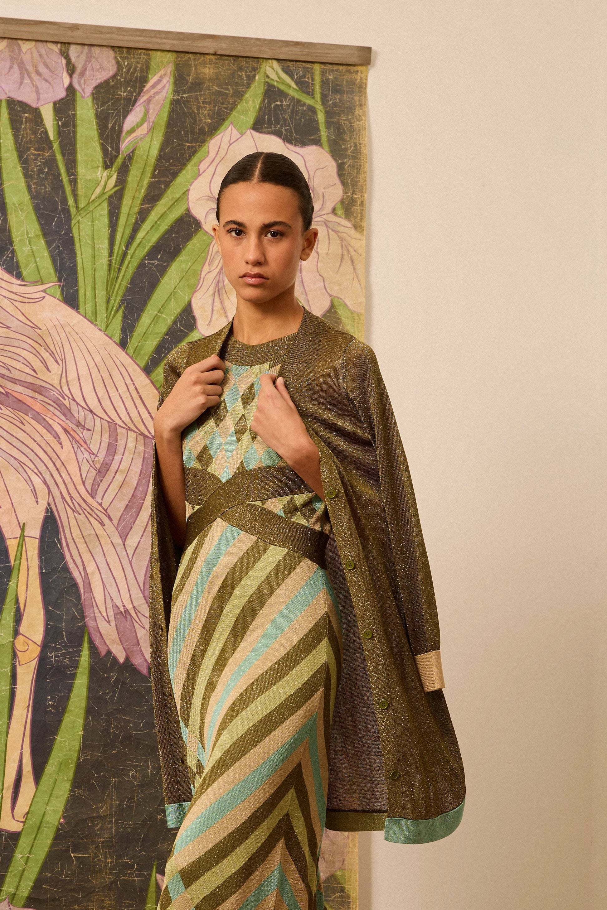 Vestido de lurex estilo midi en estampado geométrico que combina verdes con dorado y azul. Tiene cuello halter y una intersección de líneas debajo del pecho que realzan la figura