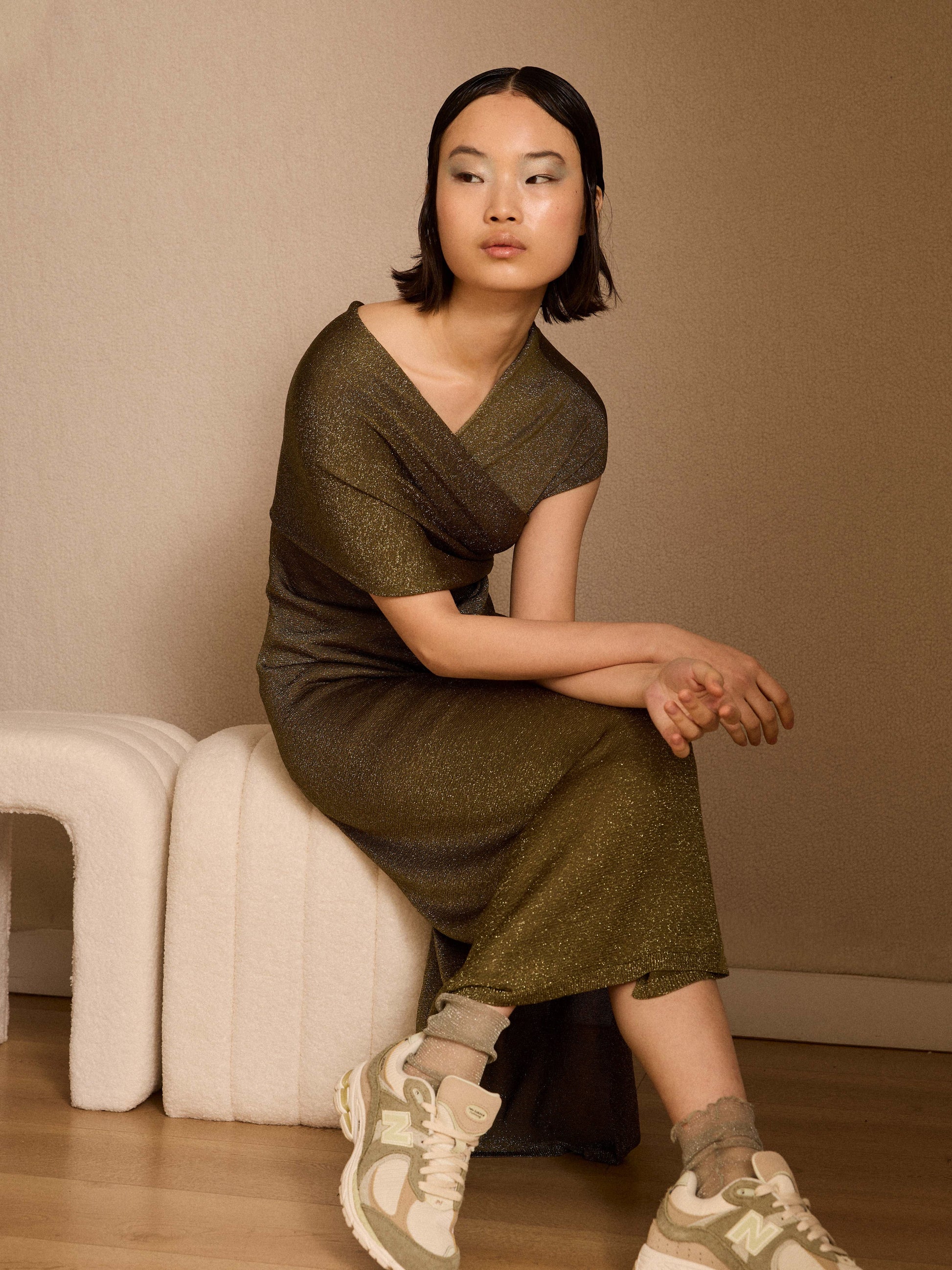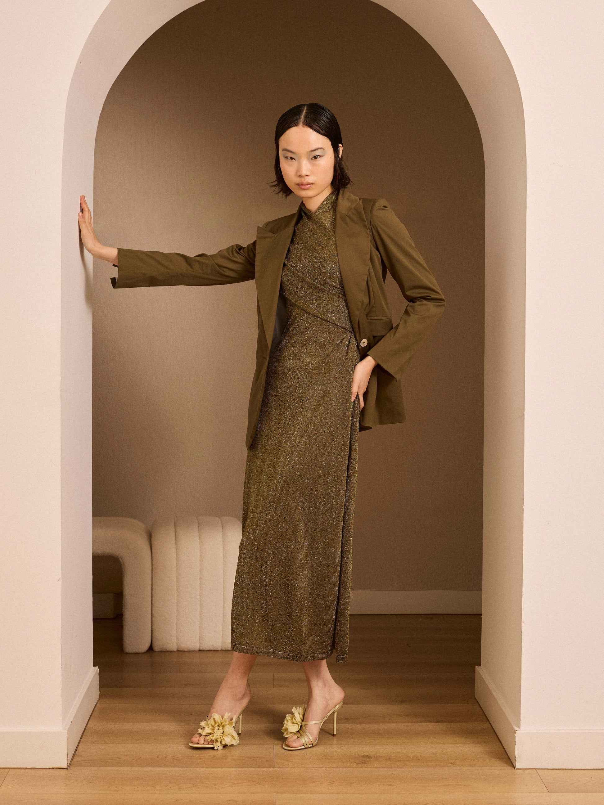 Vestido midi de lurex en color kaki con manga corta y cruce sobre hombres y escote
