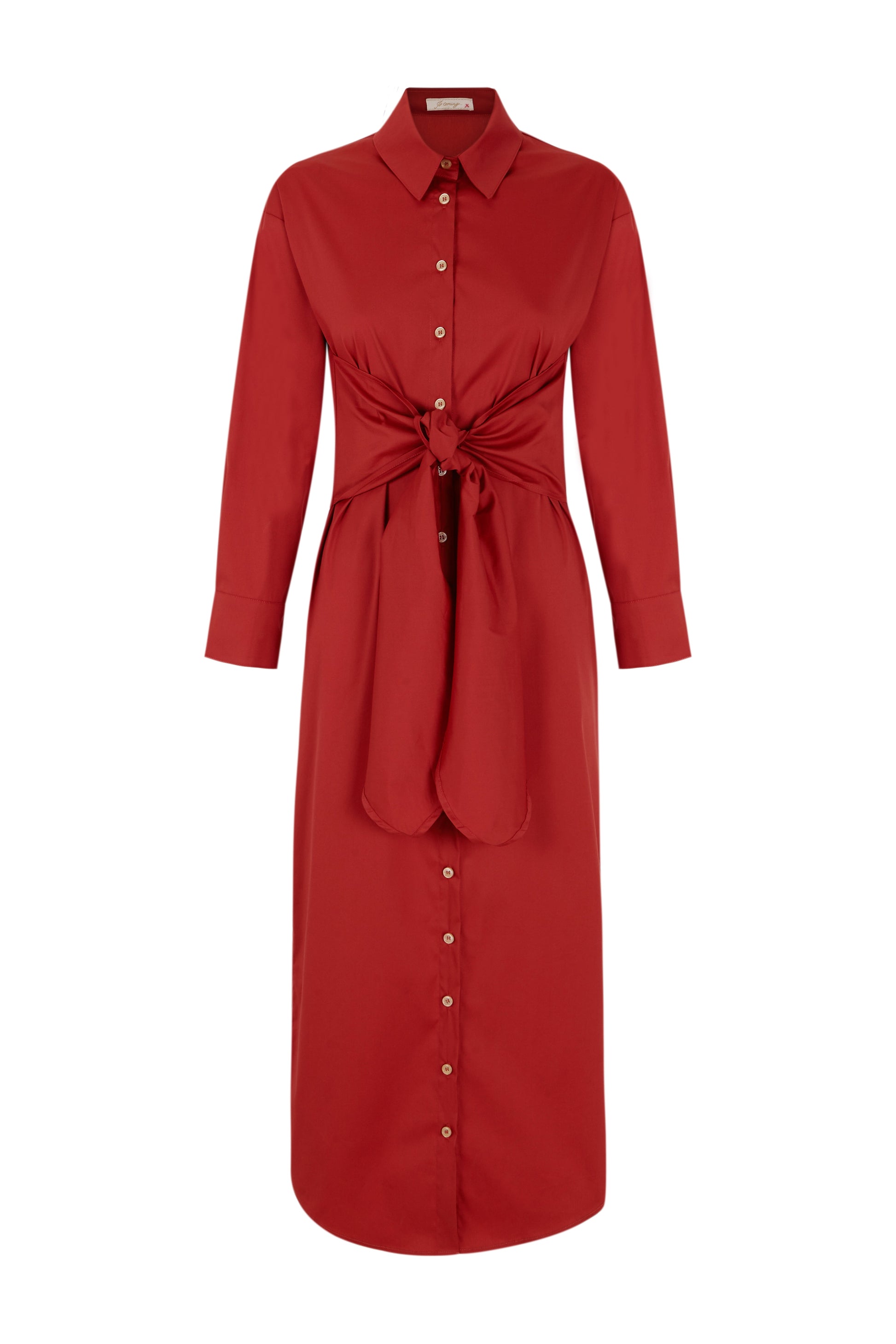 Vestido camisero de popelín de algodón en color teja con bolsillo, tiene una lazada para atar en la parte delantera o trasera. Con un poco de forma en el bajo y aberturas. Hecho en España.