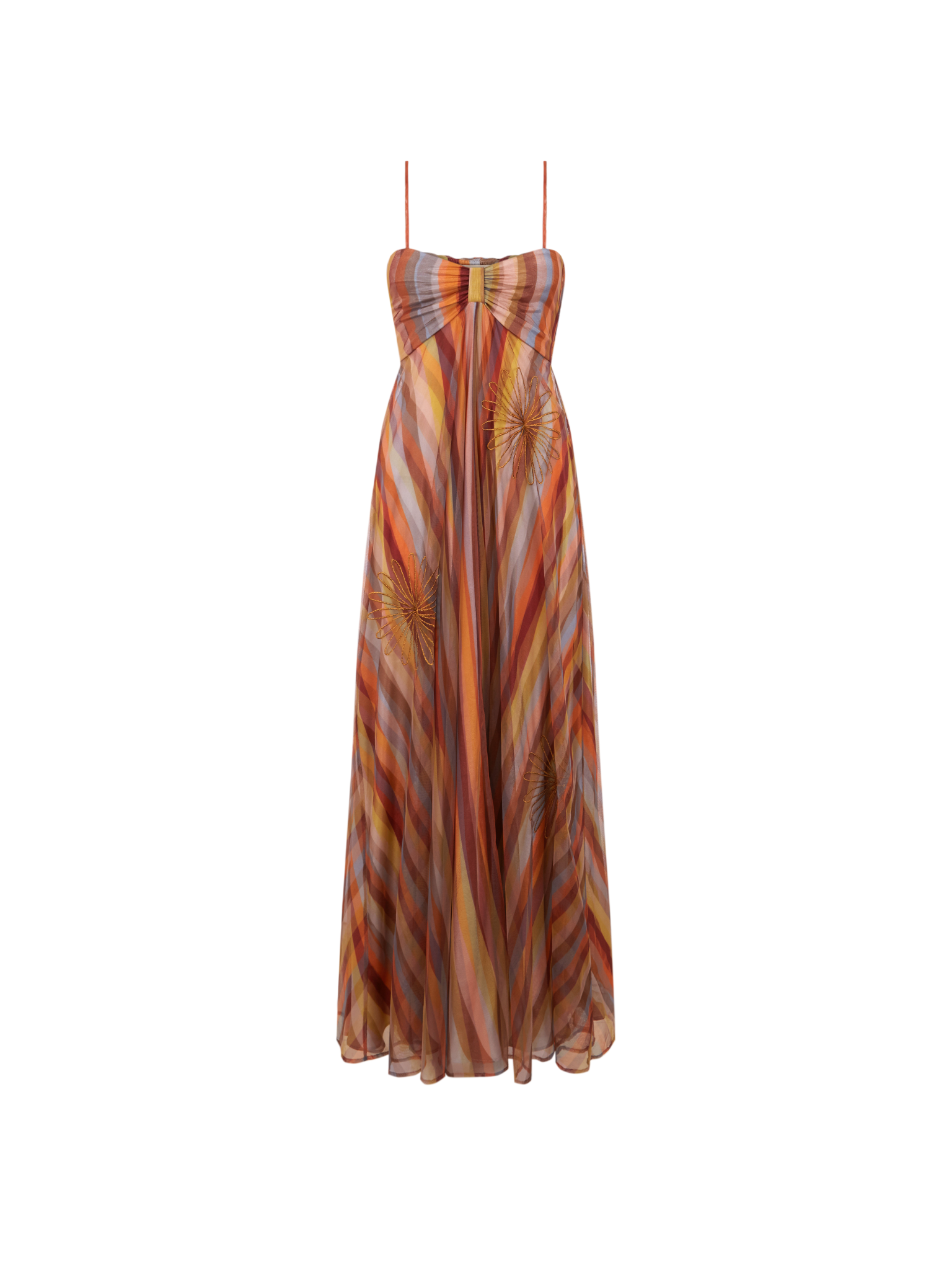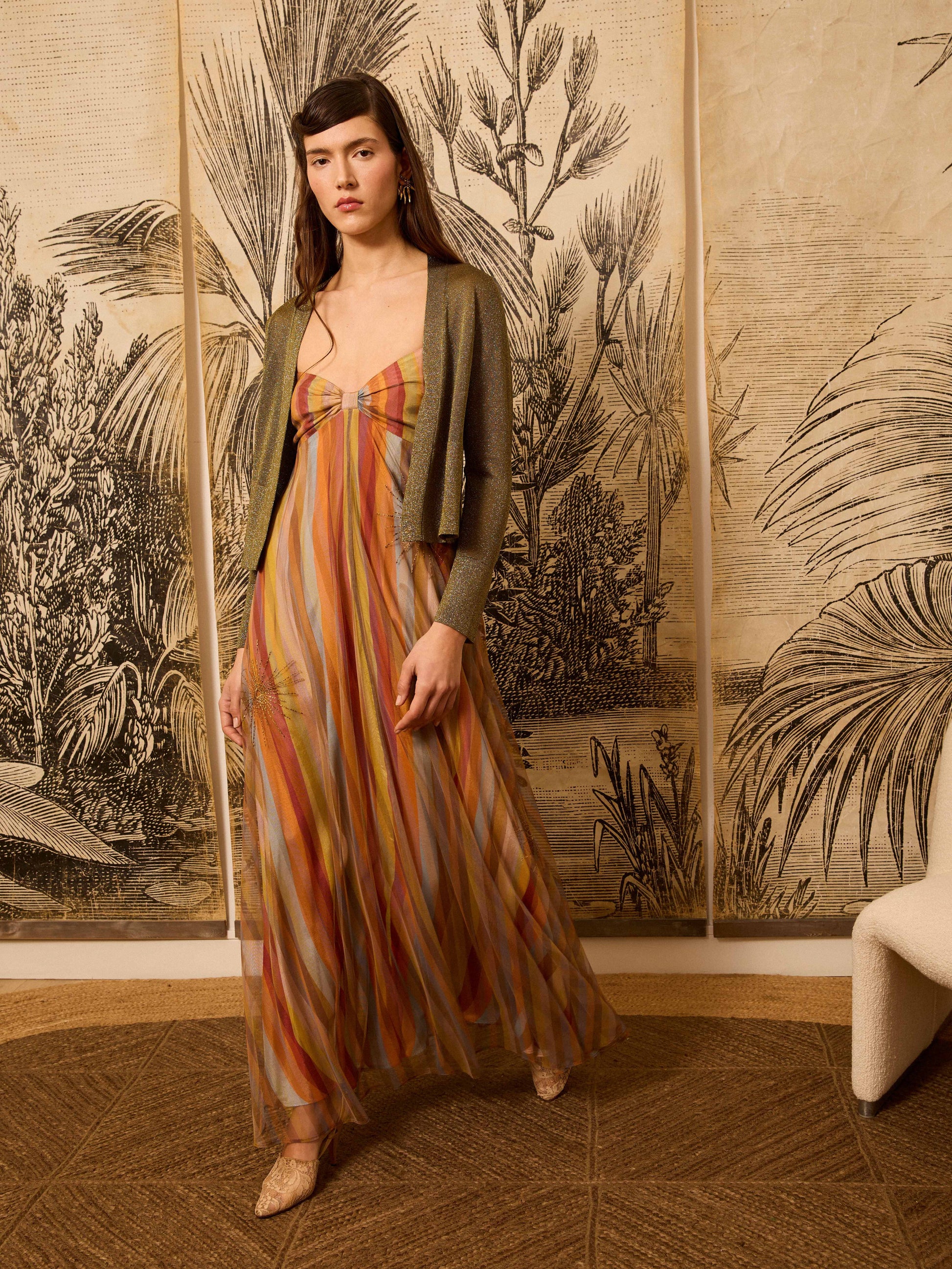 Vestido largo estampado de rayas multicolor en el tul y el forro. Con tirante fino ajustable y detalle de pecho en forma de lazo. Tiene dibujos estampados bordados con hilatural dorada sobre el tul