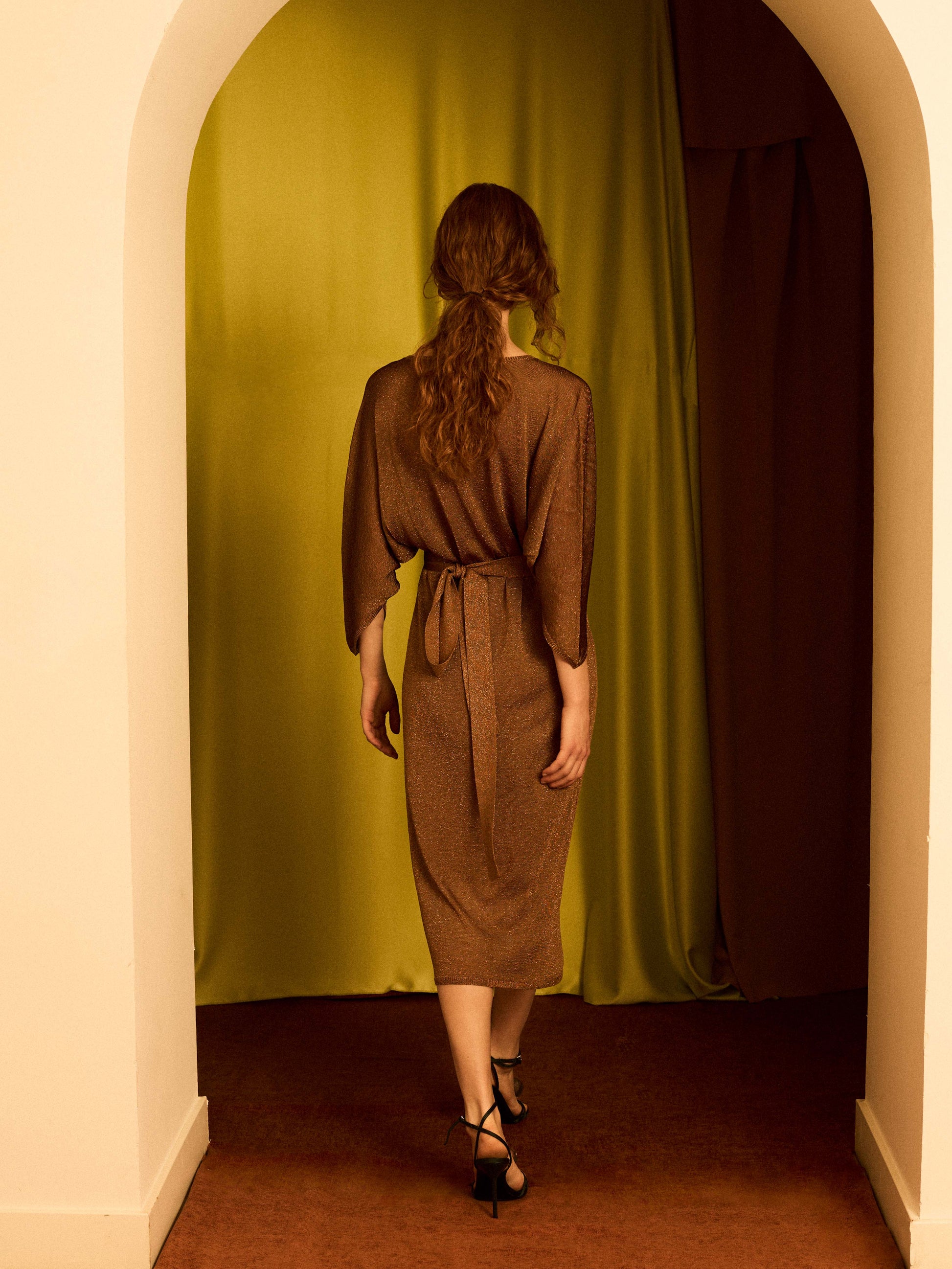 Vestido midi de cuello pico y manga larga con cinturón para anudar en color cobre