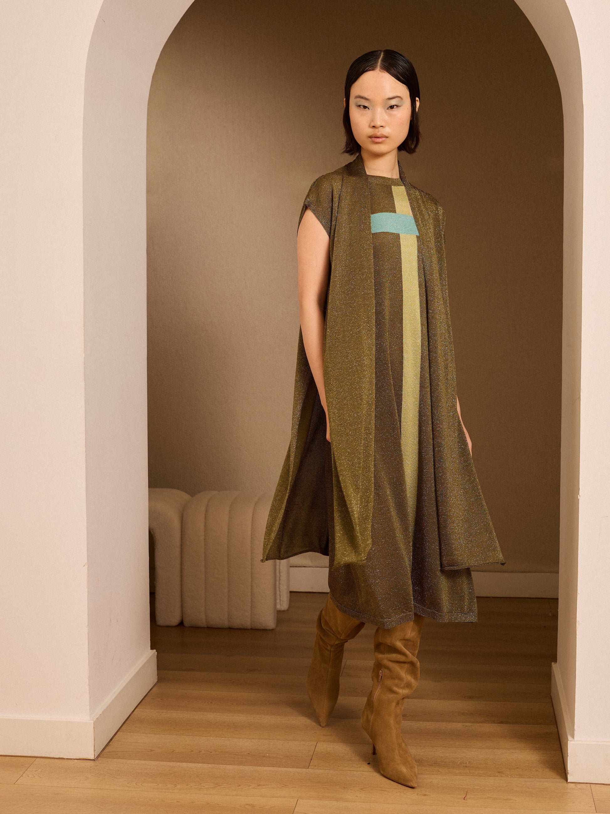 Vestido midi con hilatura metalizada en color kaki con cuello halter.Tiene dos rayas que se cruzan a contraste y un vivo en cuello y parte baja