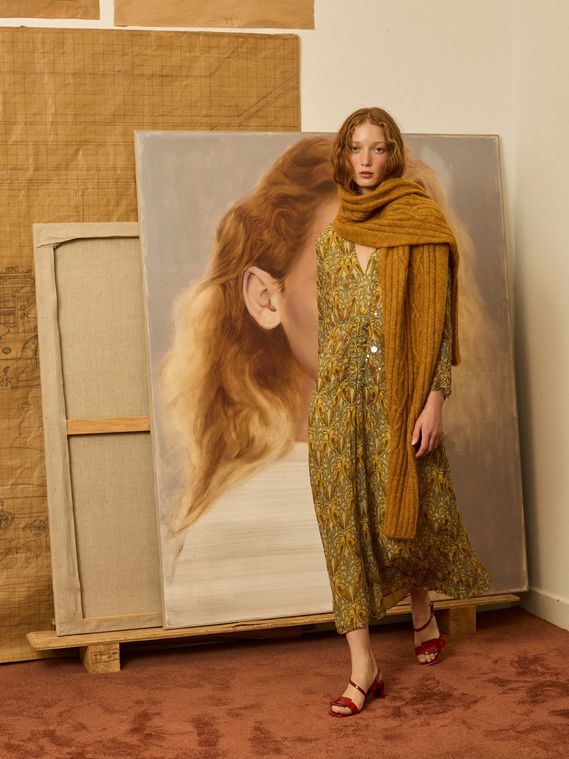 Vestido midi de crinkle de viscosa con estampado estilo art nouveau de pájaros en tonos amarillo. Escote pico y frunces en la parte delantera de la falda. Tiene salpicado de lentejuelas semitransparenten en la parte frontal.