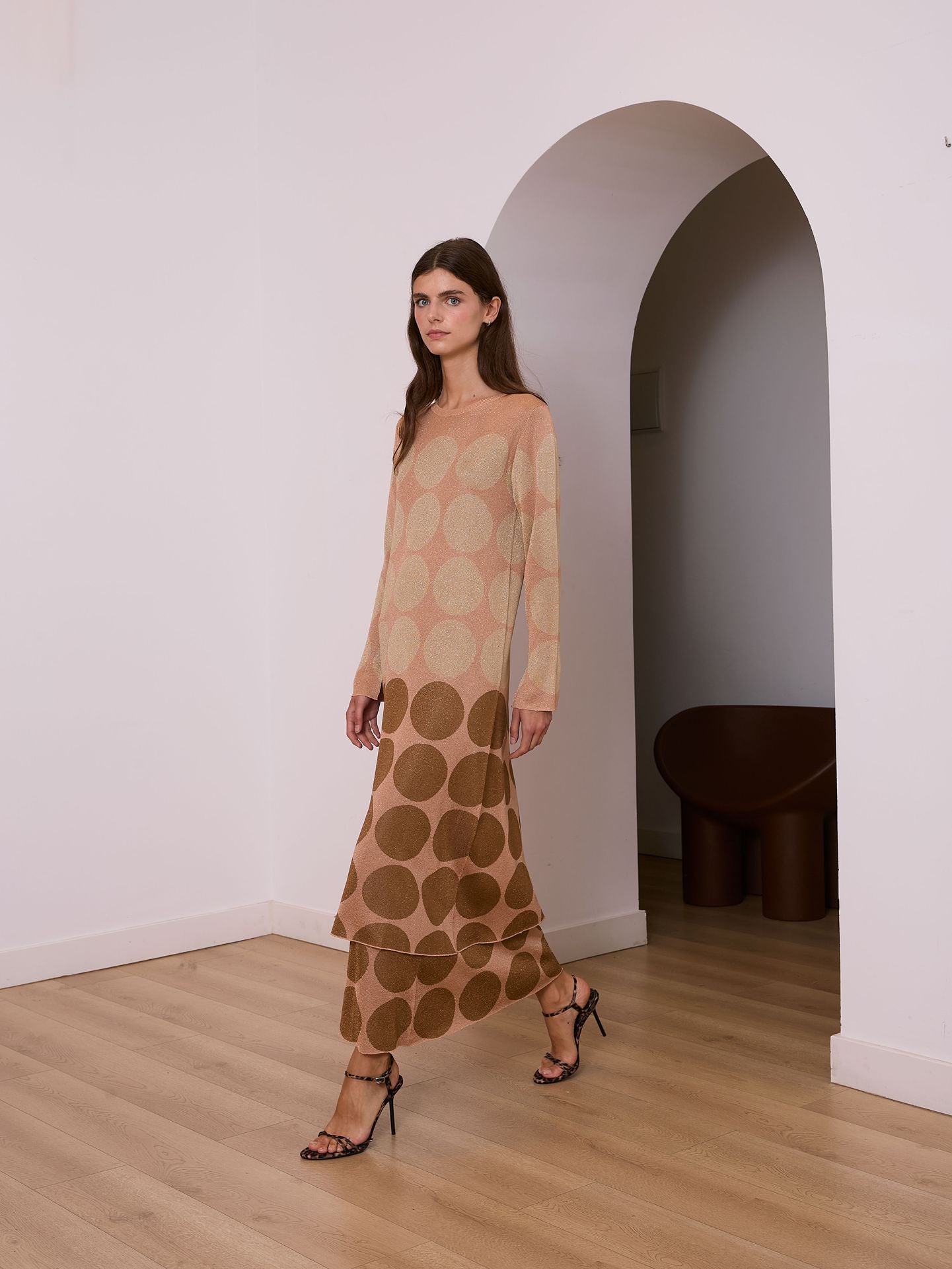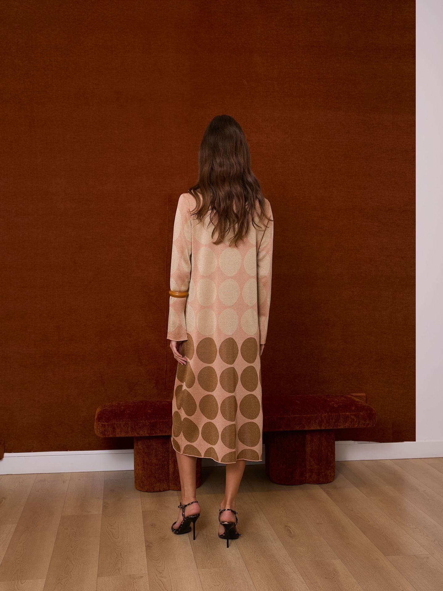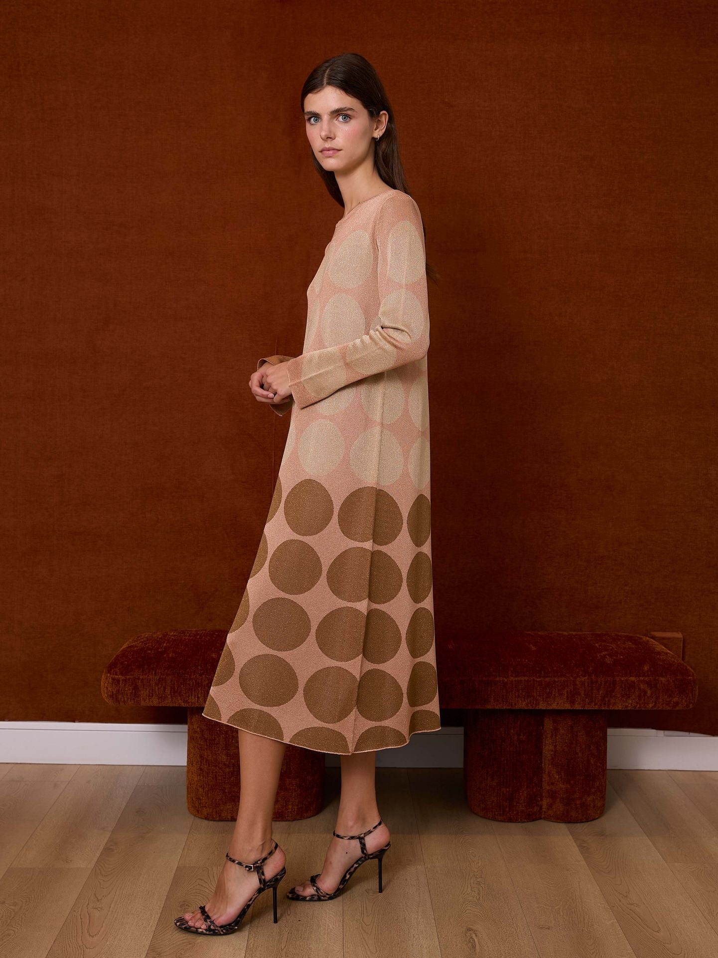 Vestido midi de lurex en color rosa con lunares en color rosa y dorado