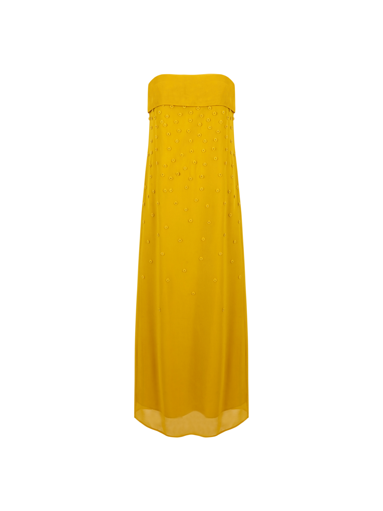 Vestido color mostaza estilo palabra de honor confeccionado en viscosa. Con doble capa en pecho y apliques bordados con forma redonda y pedrería